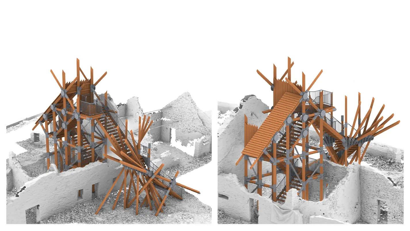 Le futur sémaphore de Rohars viendra rejoindre une constellation de cinq œuvres déjà implantées le long de l’estuaire. Sa singularité tient à son implantation : au cœur même de la ruine cristallisée du site, là où les strates du passé dialoguent avec le paysage contemporain. Pensée comme une porte d’entrée vers la découverte de Rohars et de l’estuaire, l’œuvre offrira de nouveaux points de vue, à différentes hauteurs, invitant le visiteur à lire le territoire autrement. Plus qu’un simple belvédère, le sémaphore agit comme un dispositif de révélation du site, entre sanctuarisation et ouverture.