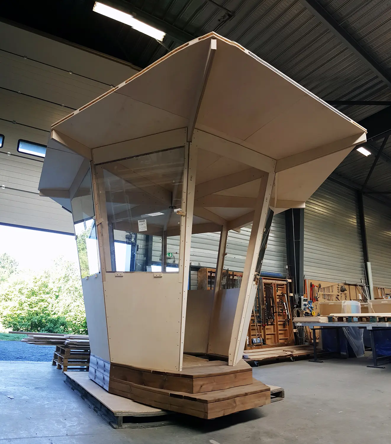 10 cabanes octogonales pour les maîtres nageurs : ossature en contreplaqué bouleau habillée de feuilles acier zinguées laquée, toiture en zinc, vitrage feuilleté
