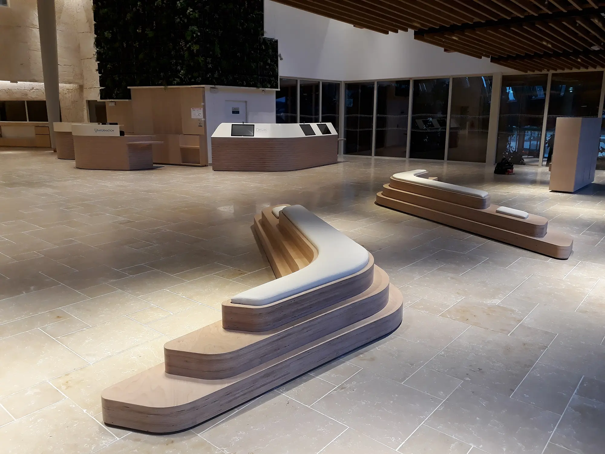 3 banques d’accueil, 2 tabourets : multiplis hêtre