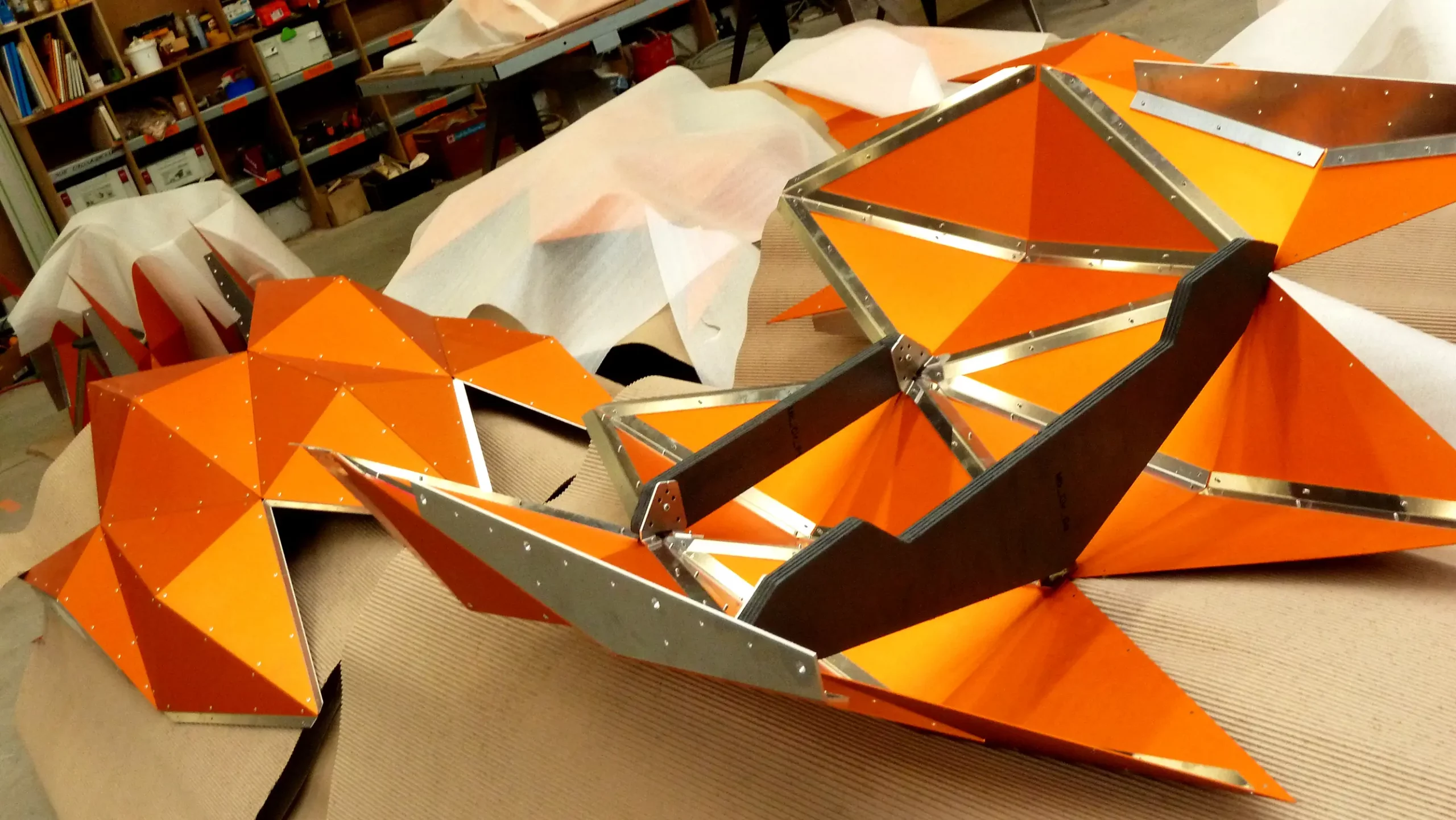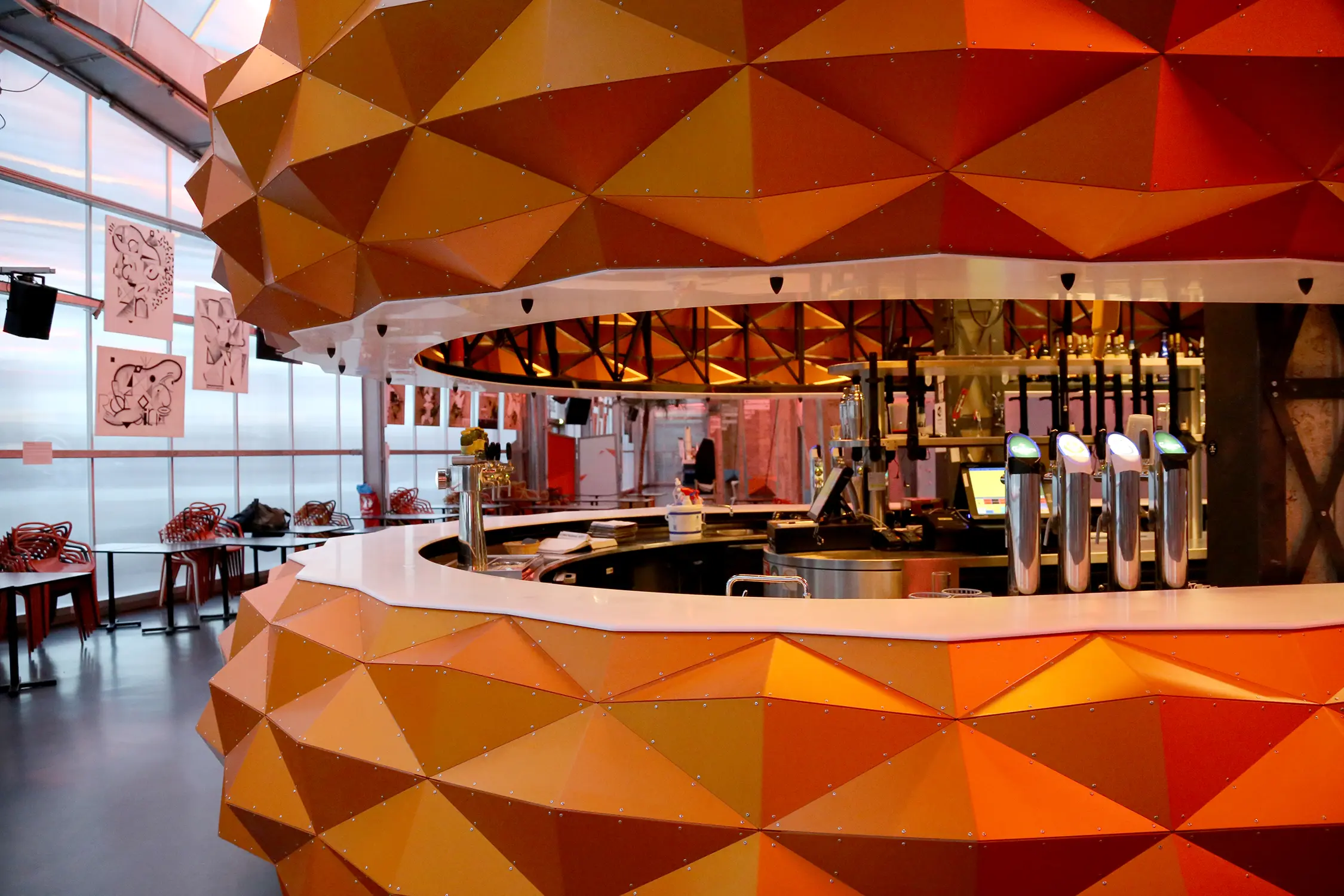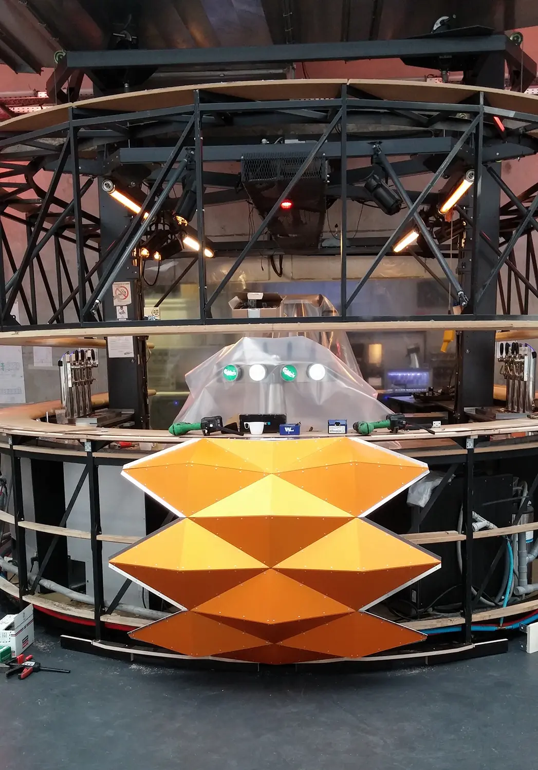 Pour cette version 2 du bar, au décompte : 126 heures d’études + 15 jours de prémontage + 1 semaine de montage + 1080 facettes + 558 tôles d’habillage + 833 cornières (représentant 333 mètres linéaires) + 287 pièces de liaison + 7812 rivets … Et tout ça juste pour boire des coups !