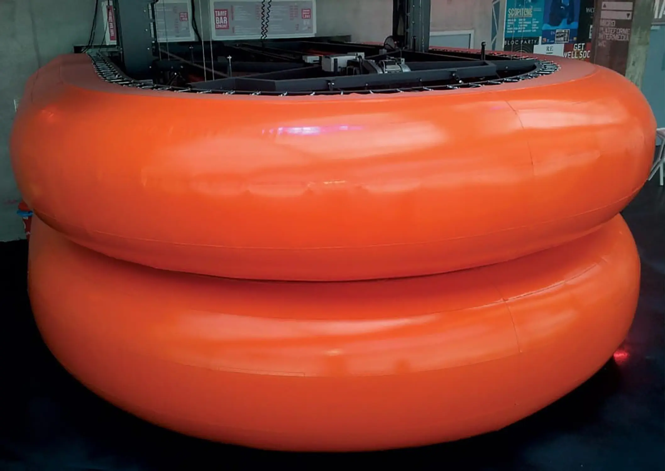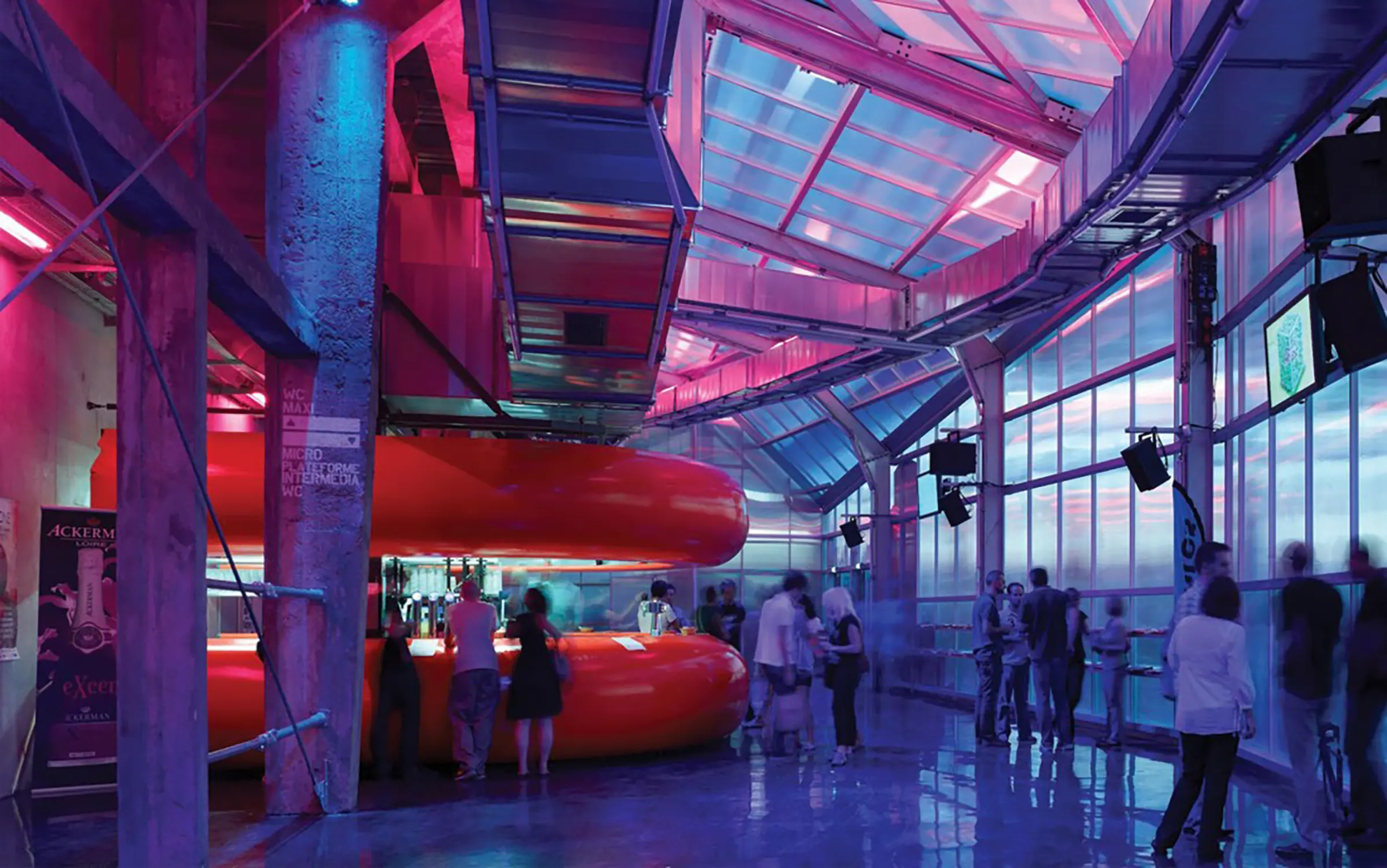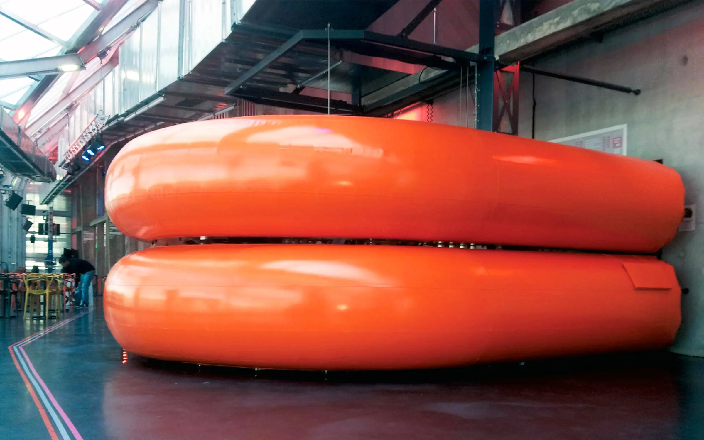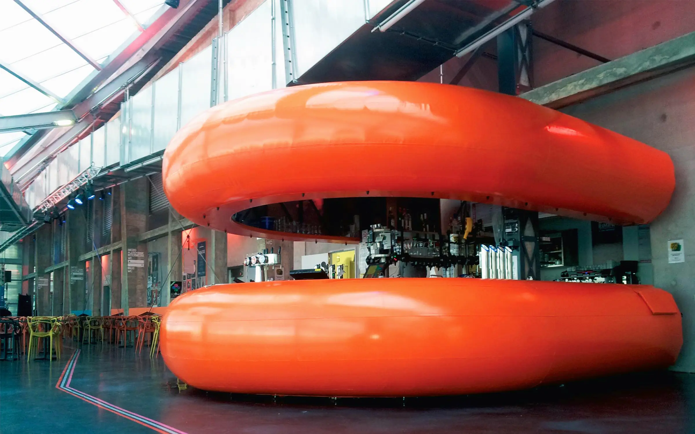 Un bar gonflé genre “bouche de Mick Jagger” pour la salle de rock, avec une petite option James Bond, quand la lèvre supérieure ferme le comptoir.