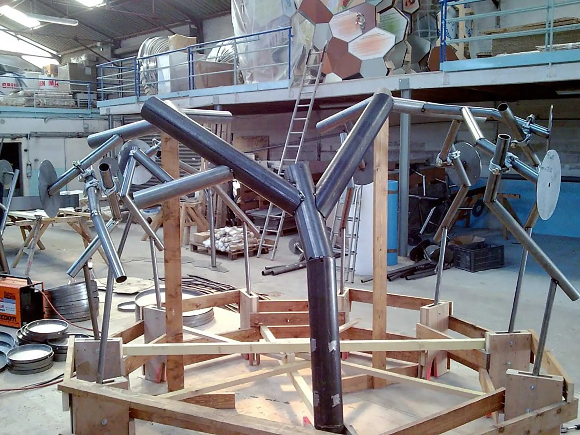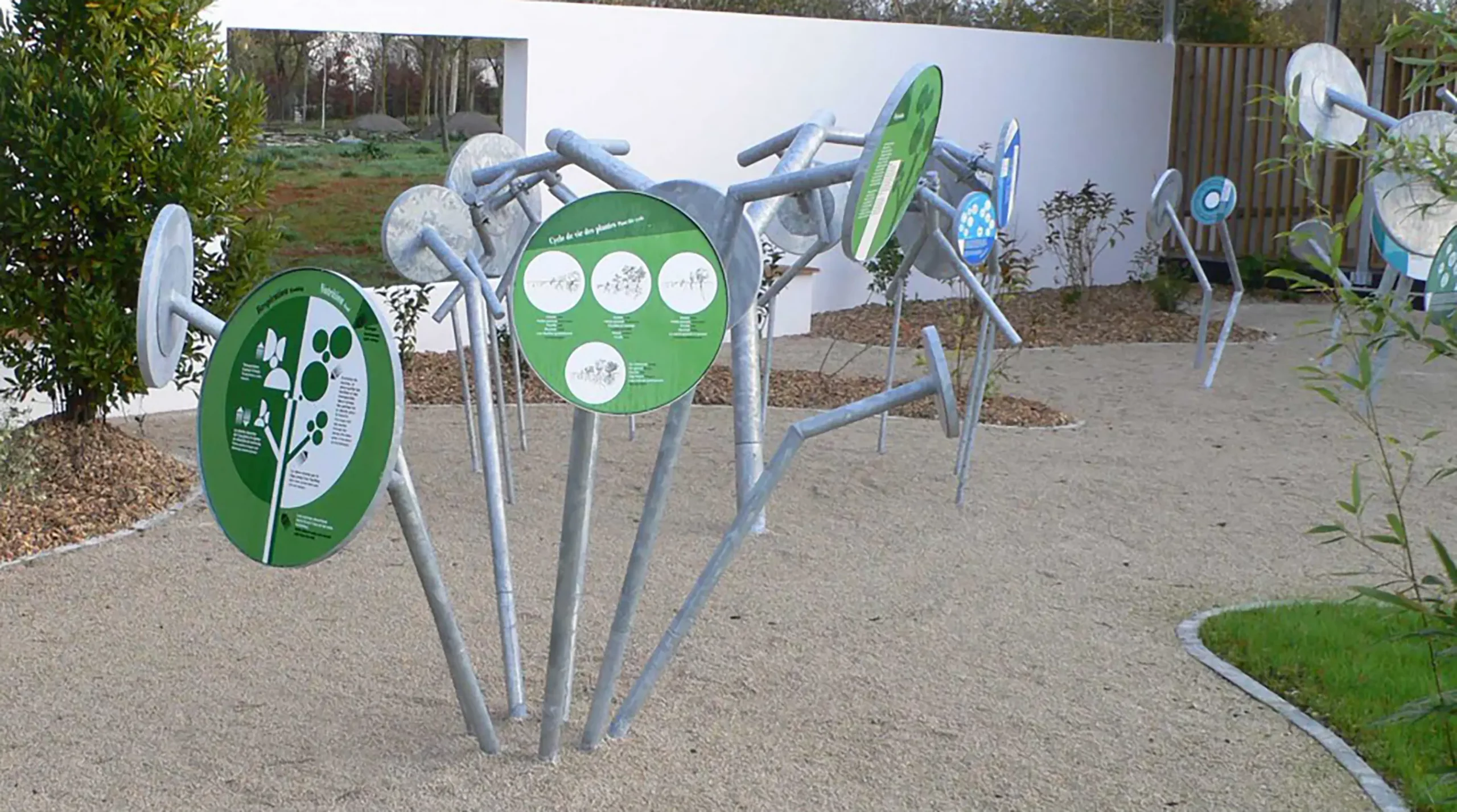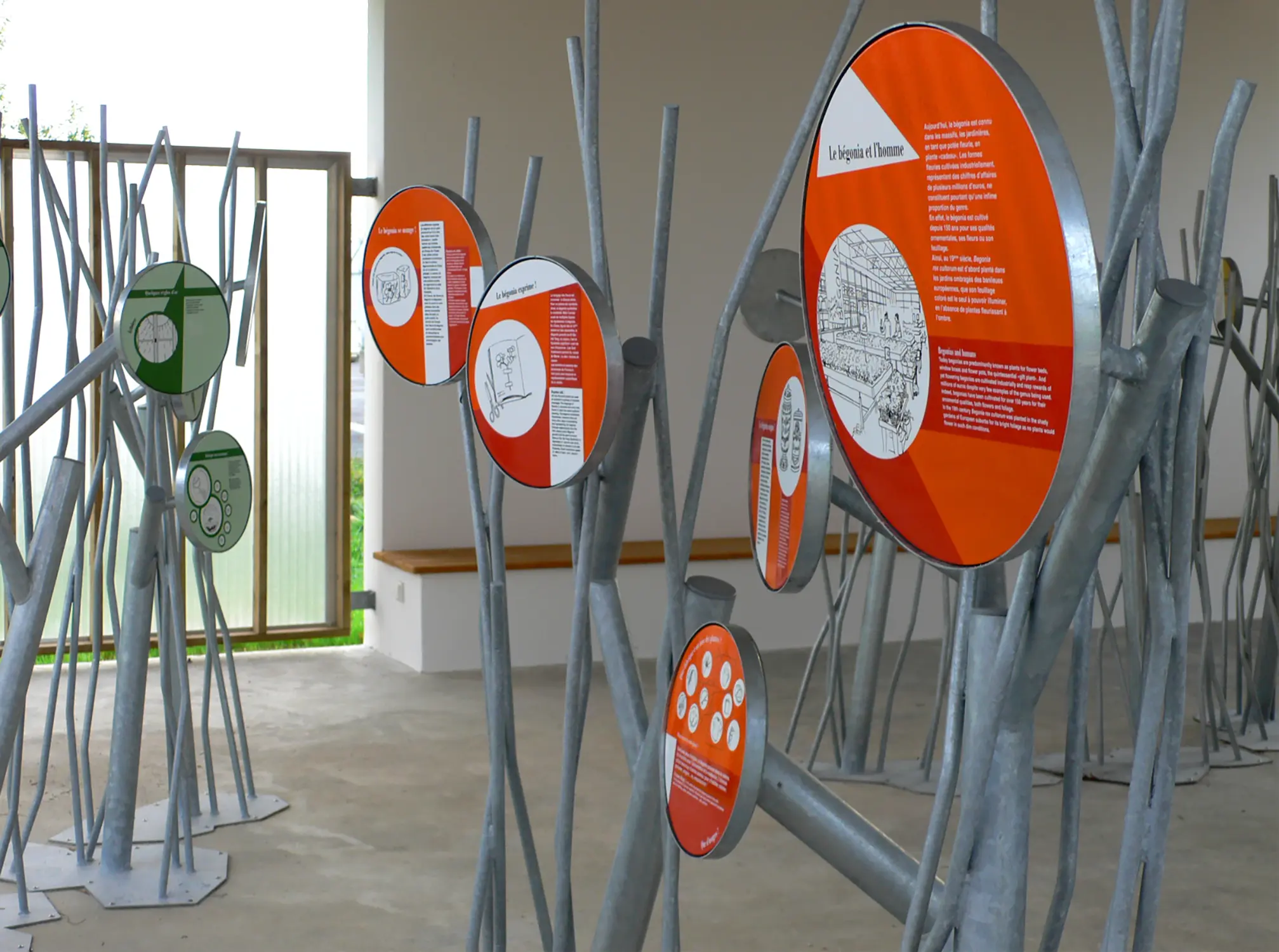 Bouquets de disques émaillés sur tiges d’acier galvanisé comme une allégorie des plantes qu’ils décrivent.