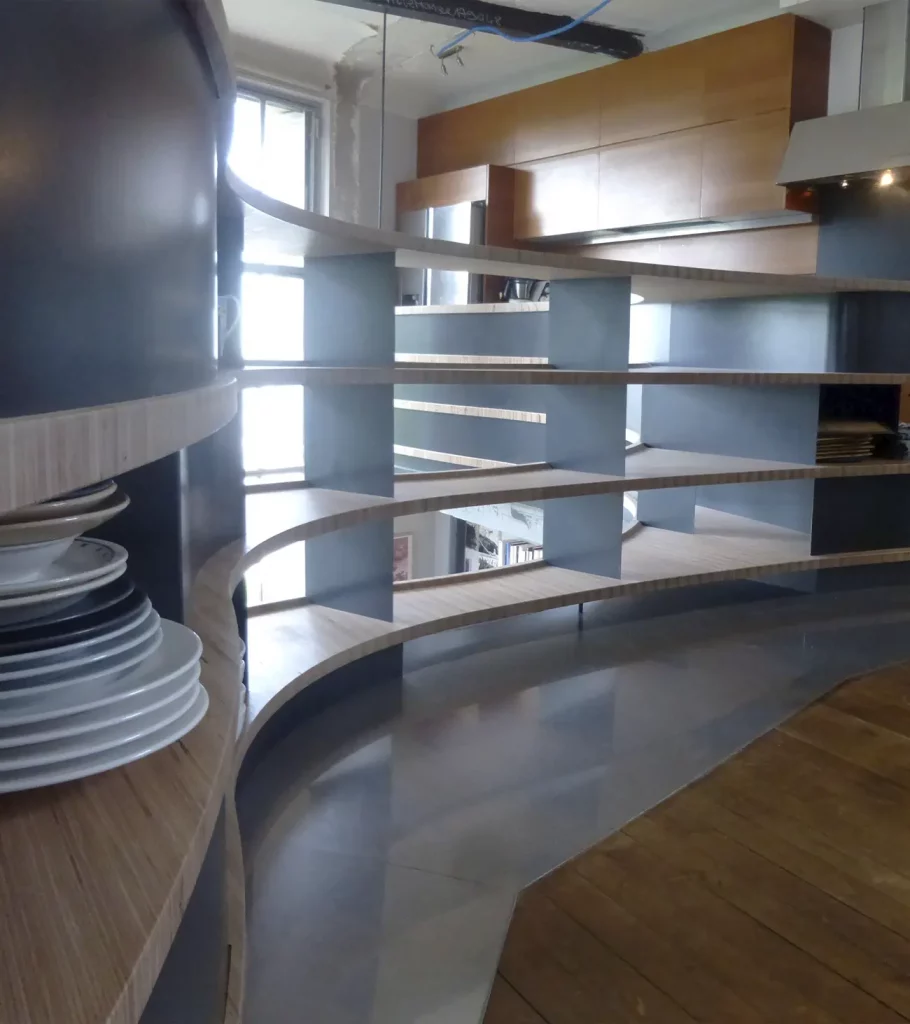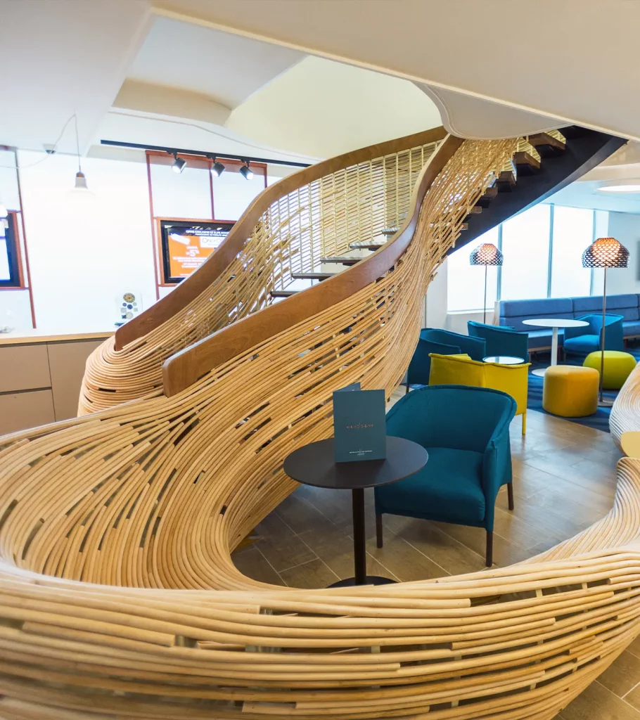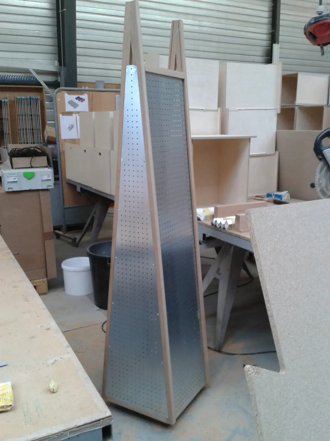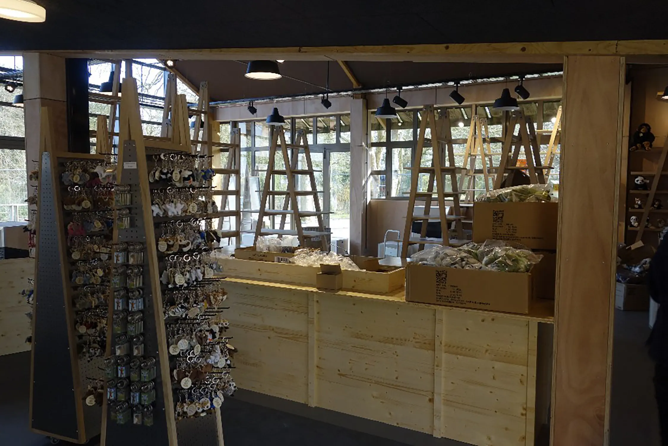 Dans la boutique de l’accueil, les échelles de présentation des produits ainsi que les présentoirs à magnets sont réalisés sur mesure. Pour le restaurant, des porte-menus extérieurs sont conçus et fabriqués.