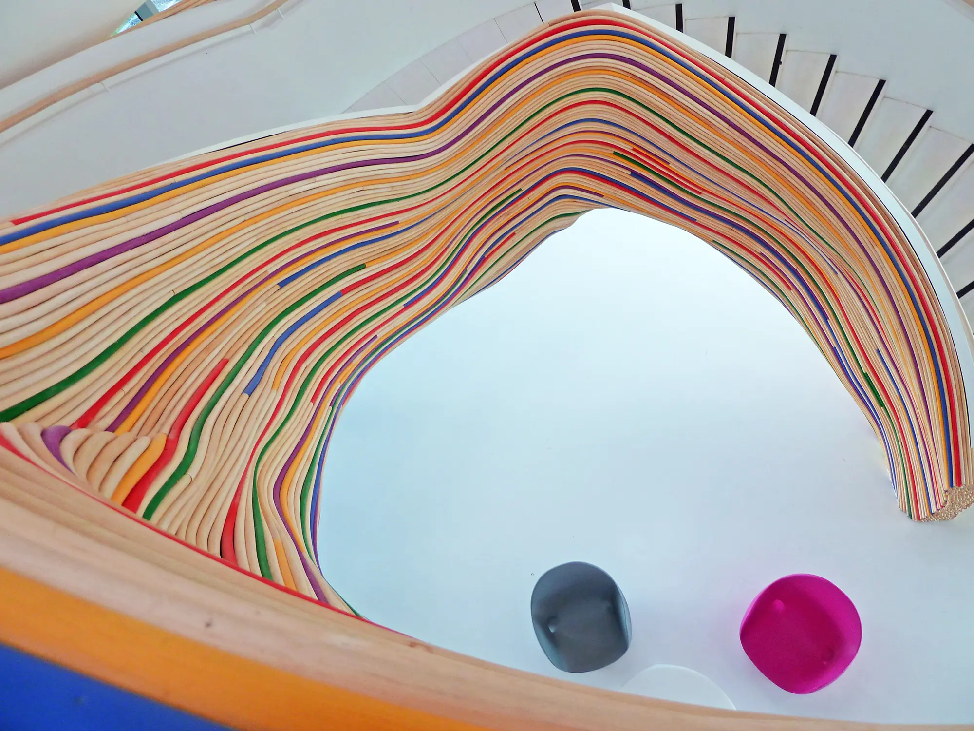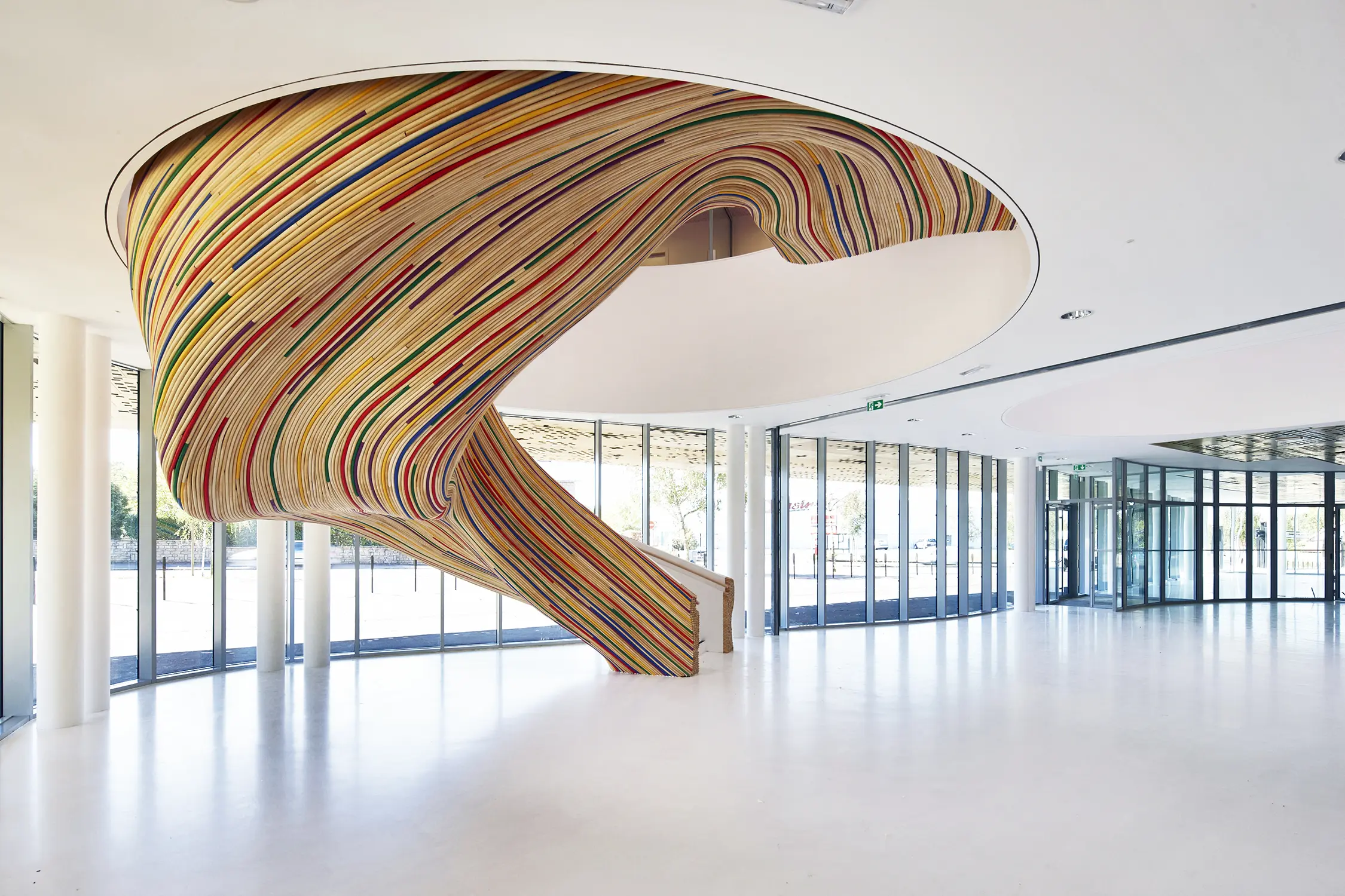 Habiller un escalier avec de la fibre naturelle afin qu’il “limaçonne” dans l’espace de l’École des Arts.