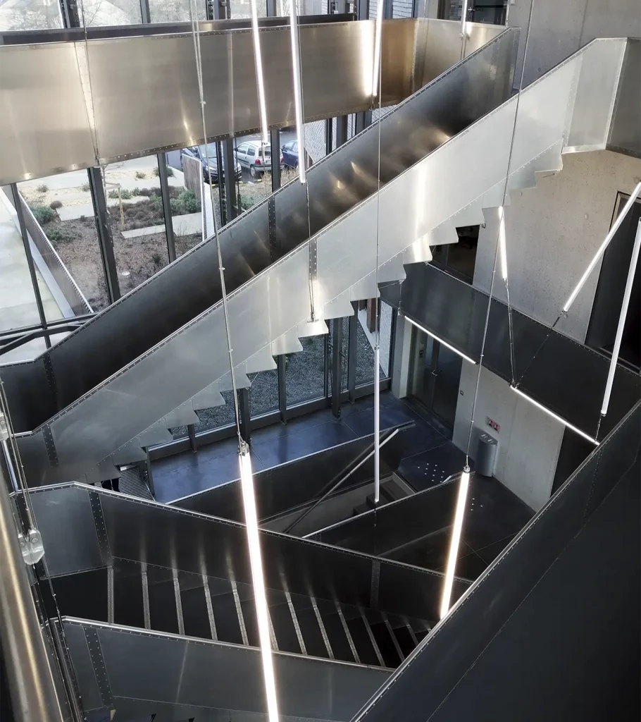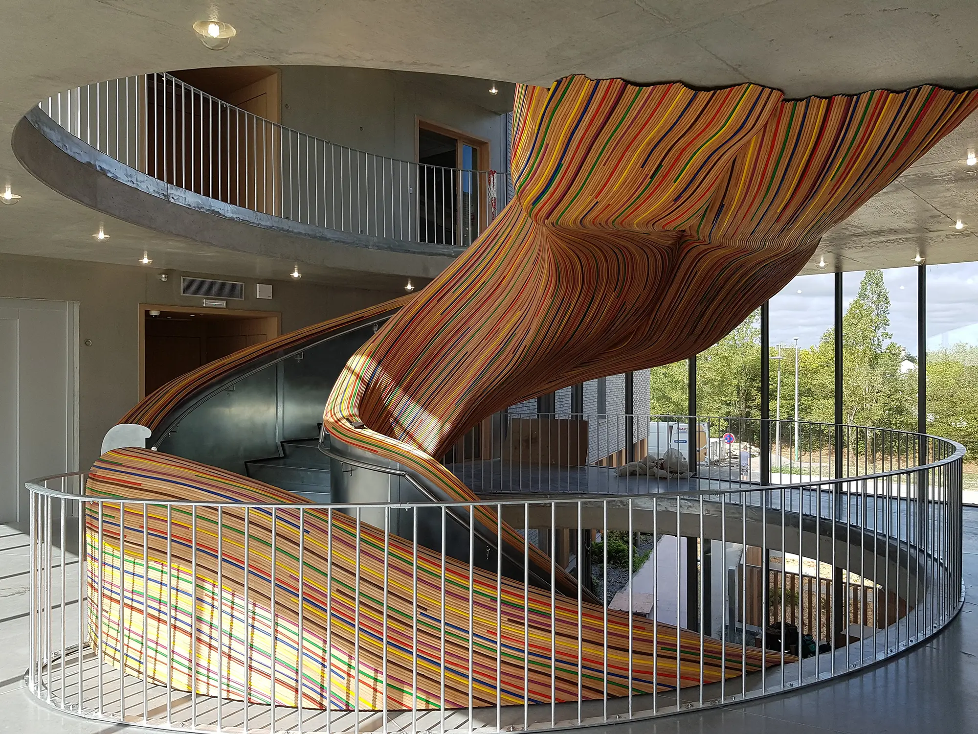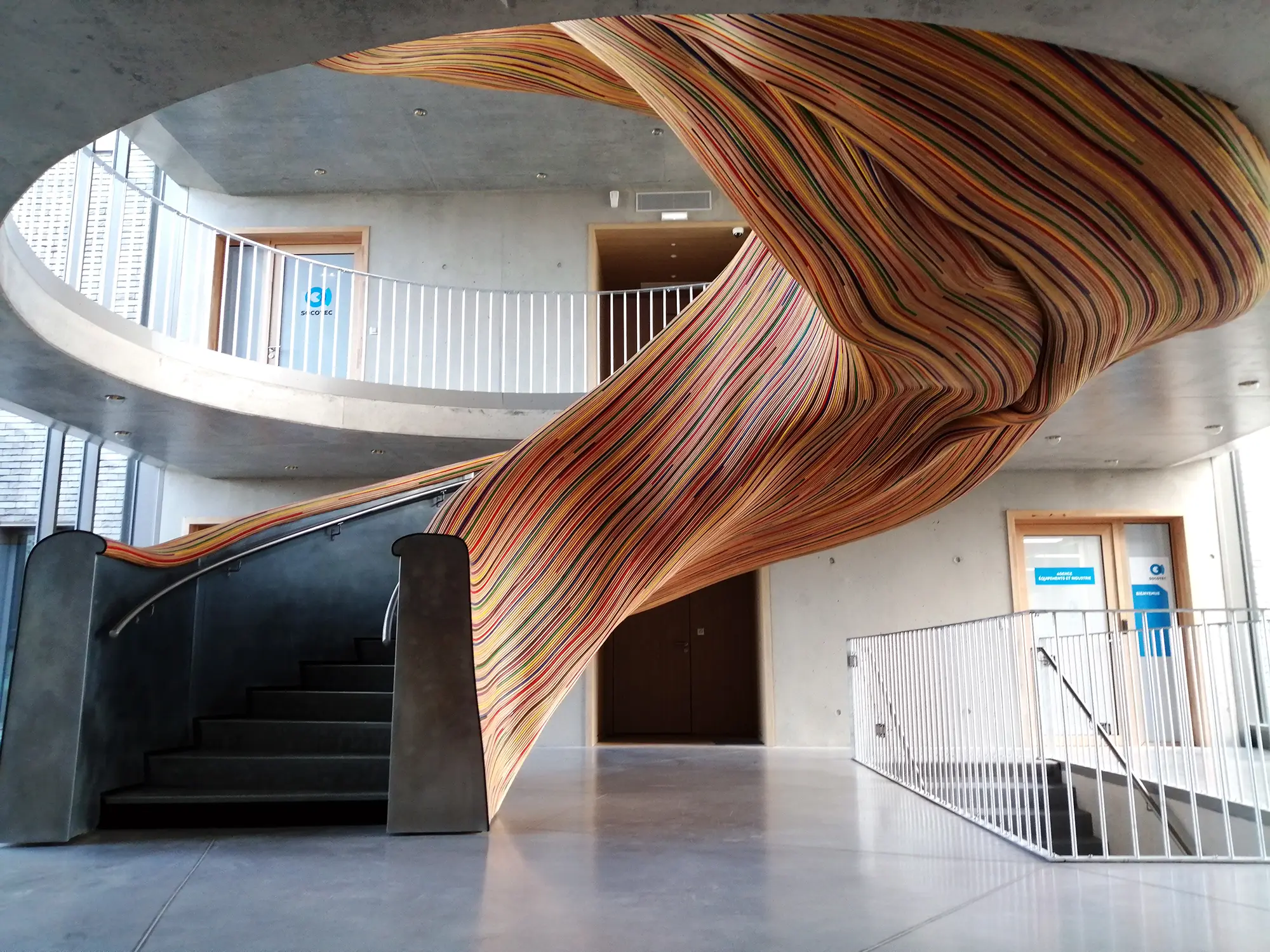 Pour le 3e bâtiment, livré en 2019, Métalobil dessine, conçoit et réalise un escalier hélicoïdal en acier galvanisé habillé de brins de rotins colorés, inspiré de l’escalier de l’Ecole des Arts de St Herblain co-signé Tetrarc/Métalobil, à la demande du client.