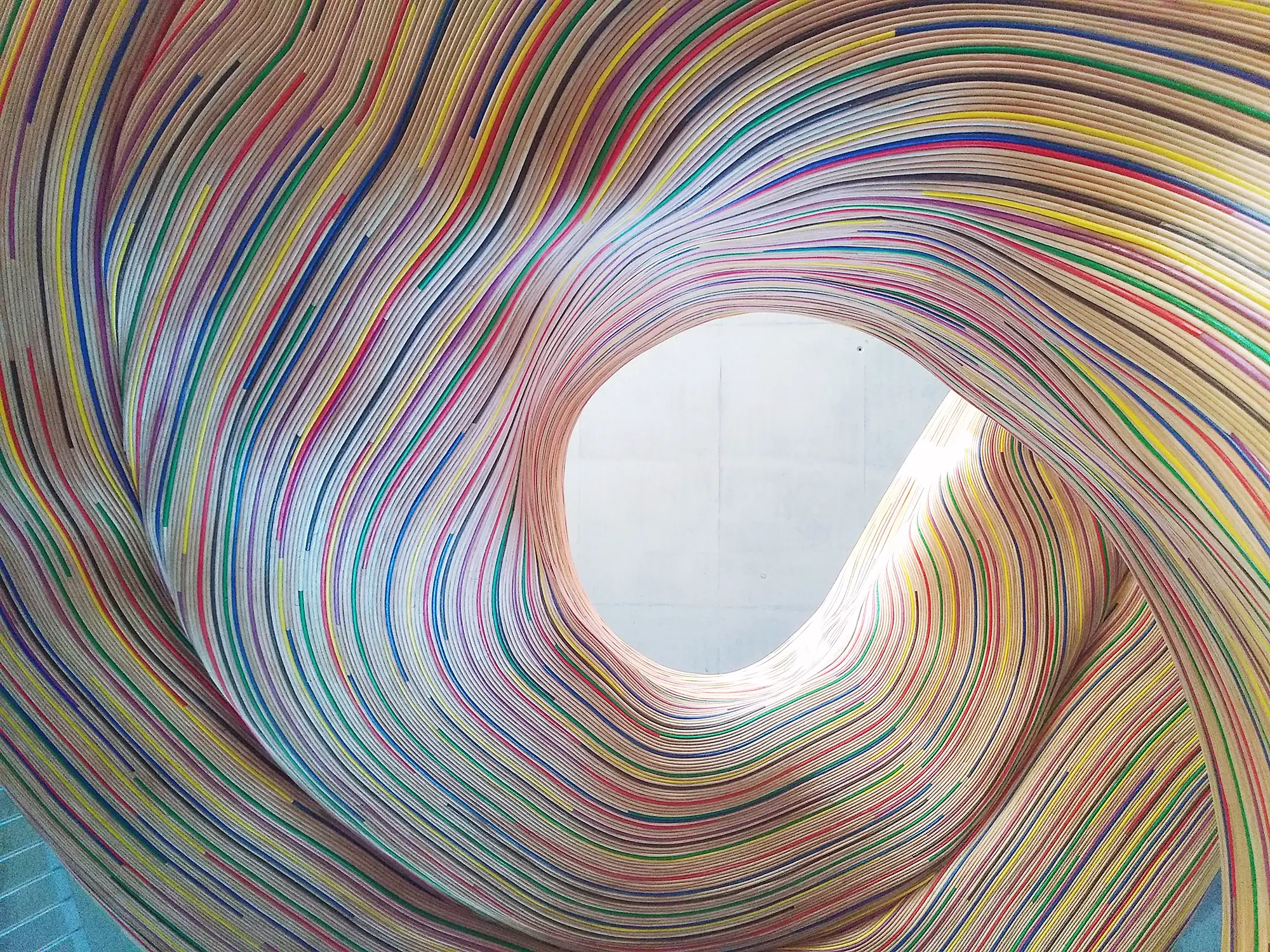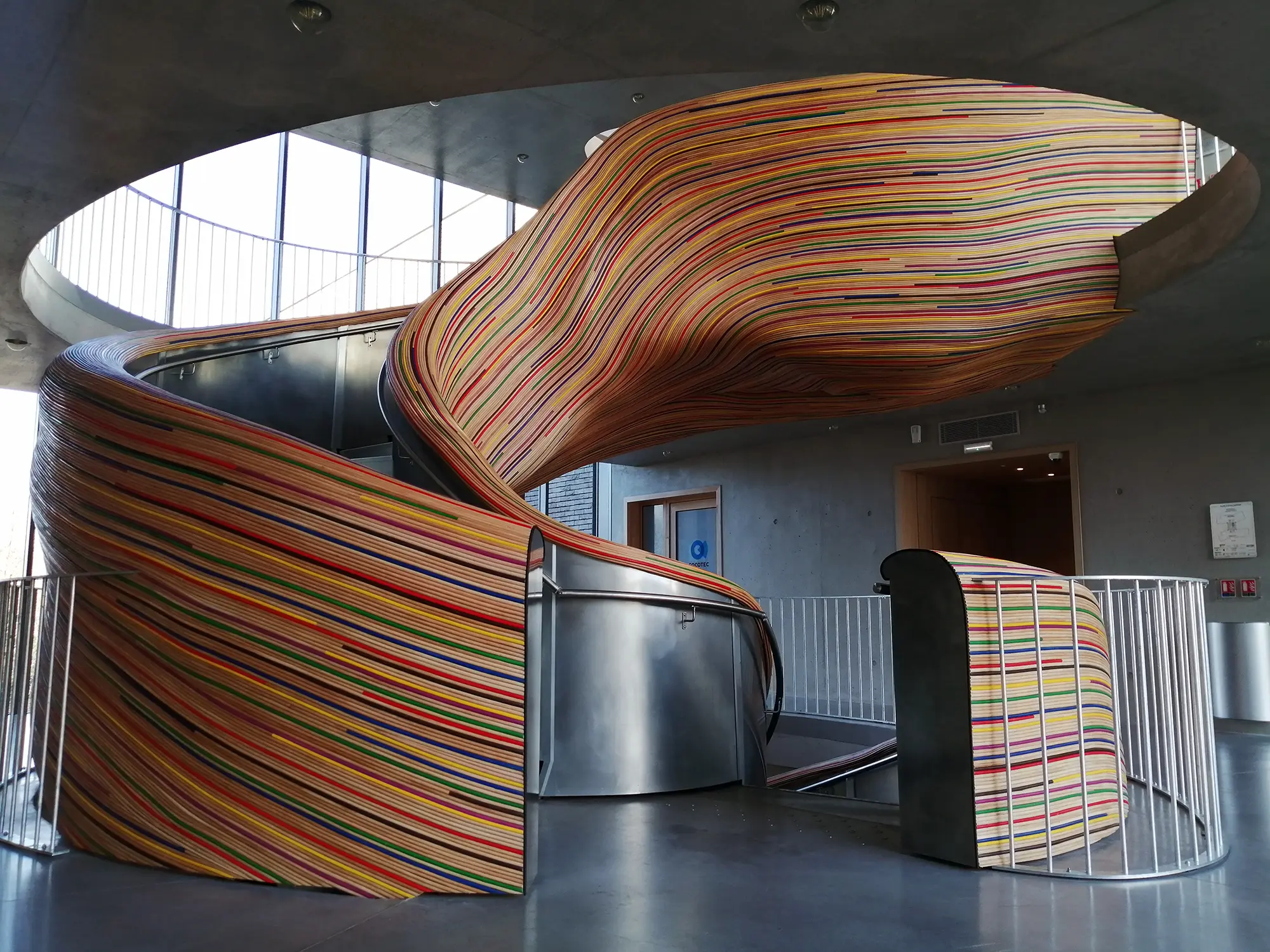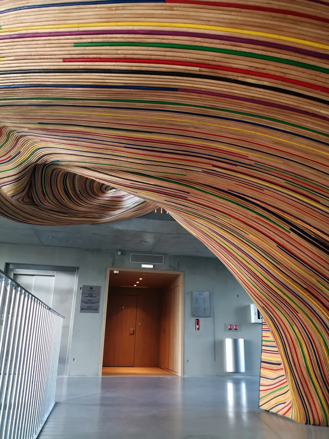 Pour le 3e bâtiment, livré en 2019, Métalobil dessine, conçoit et réalise un escalier hélicoïdal en acier galvanisé habillé de brins de rotins colorés, inspiré de l’escalier de l’Ecole des Arts de St Herblain co-signé Tetrarc/Métalobil, à la demande du client.