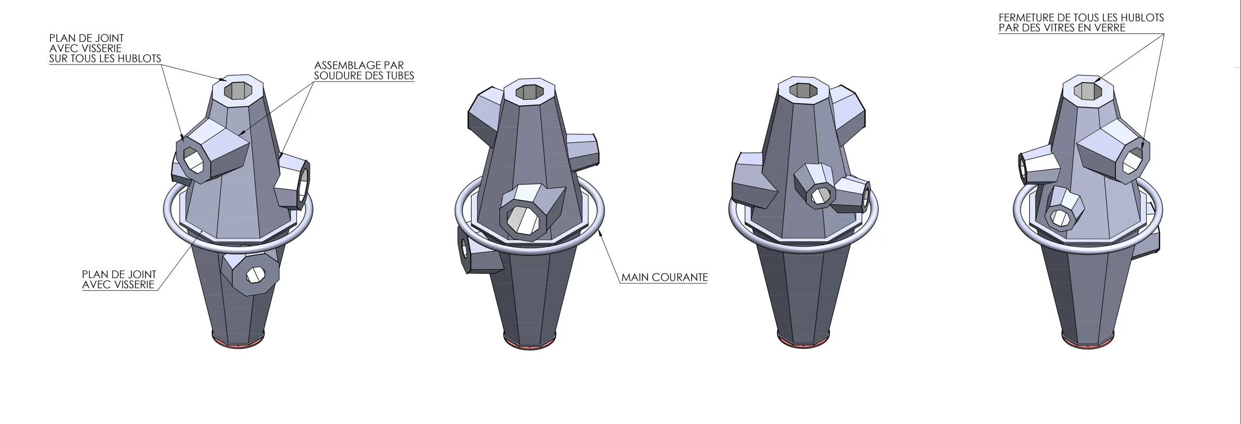L’un, droit et évasé, adopte une section hexagonale à six faces ; le second est orienté en coude vers le ciel, se développe sur une géométrie octogonale et le troisième en format périscope, présente une section carrée.