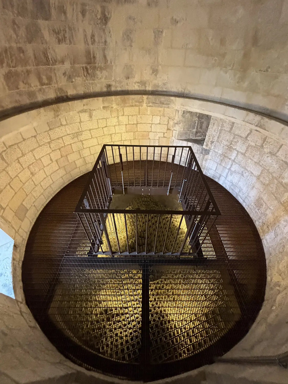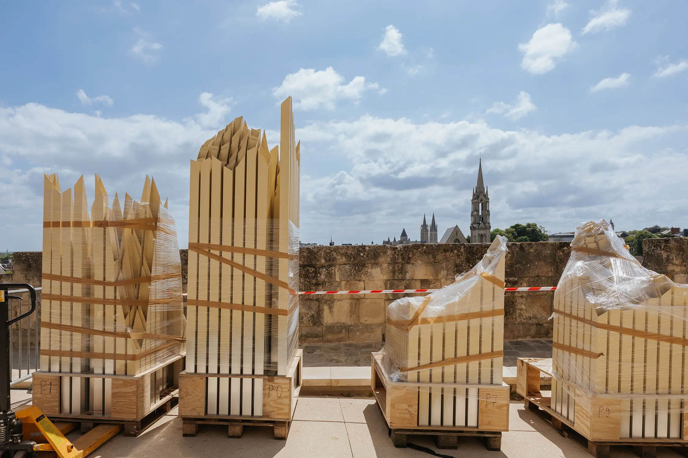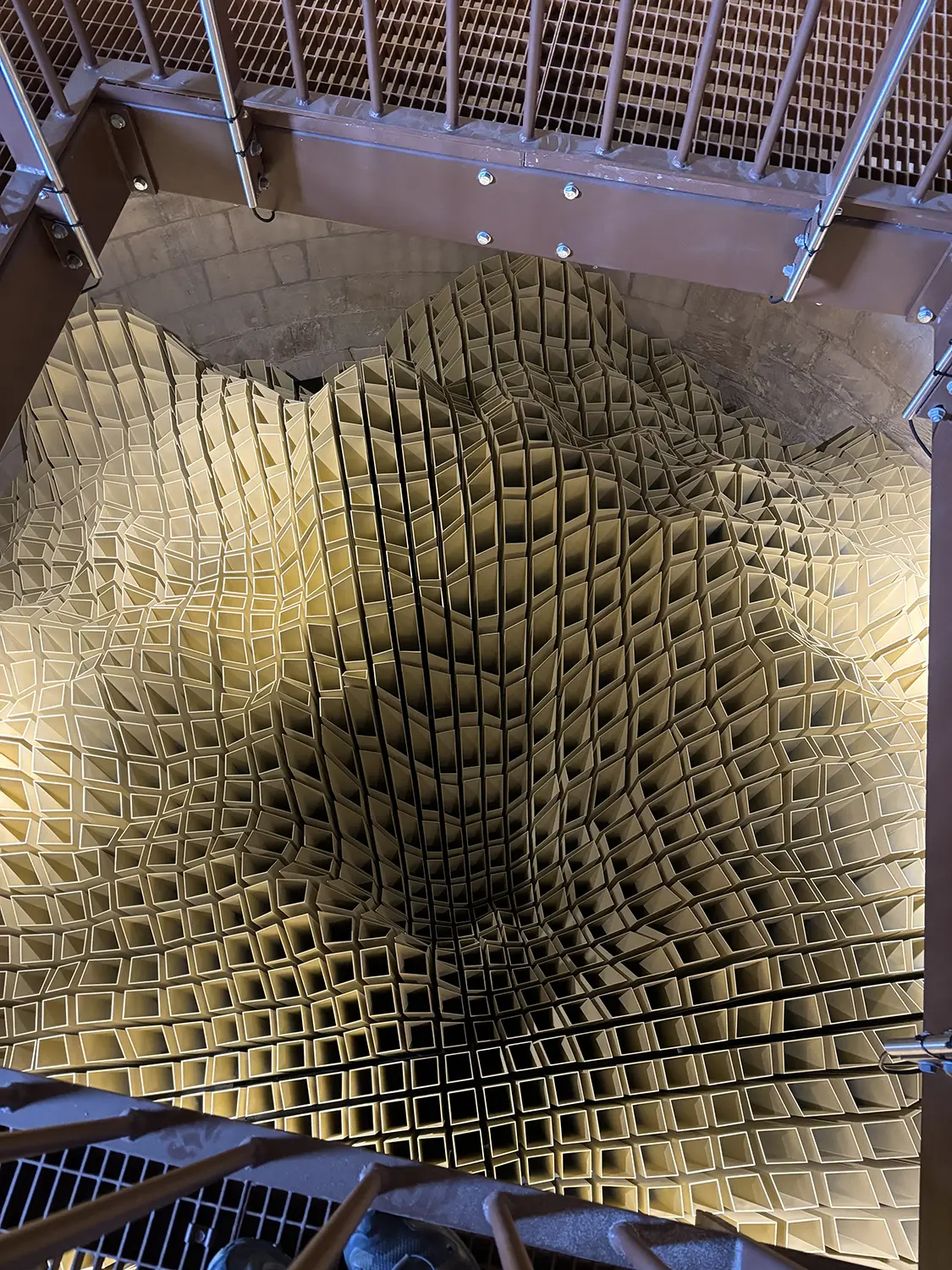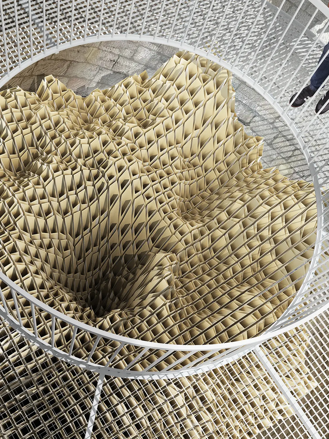 La Pierre et le Sablier, installation créée pour la Tour Puchot du Château de Caen, se compose de plusieurs étages à découvrir progressivement. Au sommet, des blocs métalliques s’empilent, en bas, une cavité semble se creuser au fur et à mesure de l’écoulement de la matière qui la compose. Une passerelle permet d’observer ce sablier géant. L’œuvre interroge notre rapport au temps, liant passé et présent, et à l’espace, la manière dont utilisons les ressources naturelles.