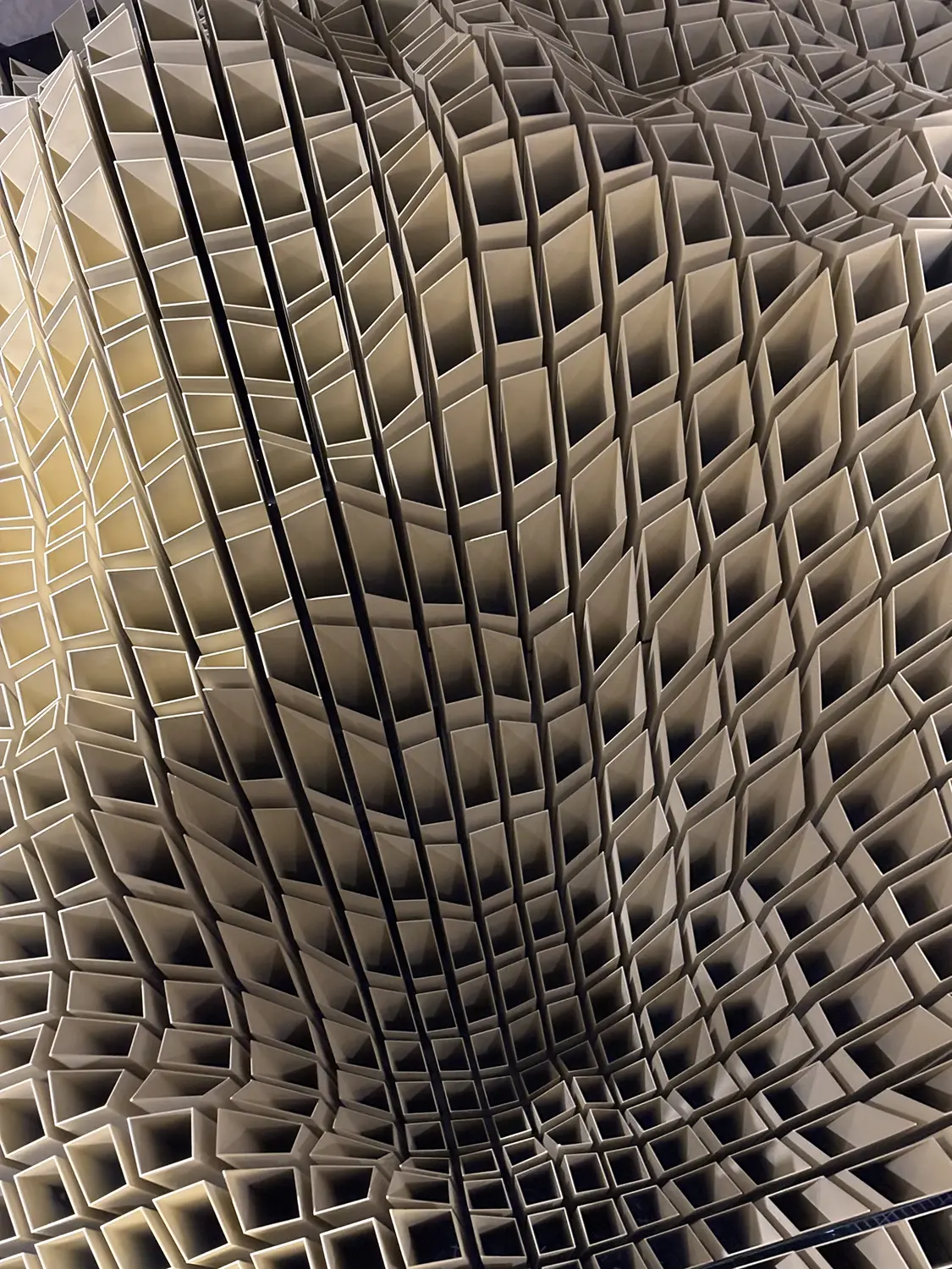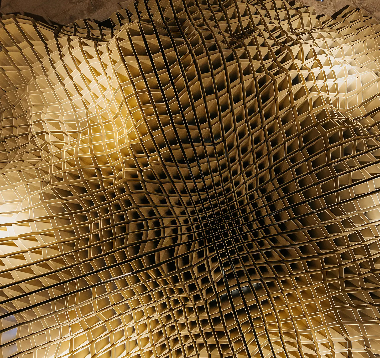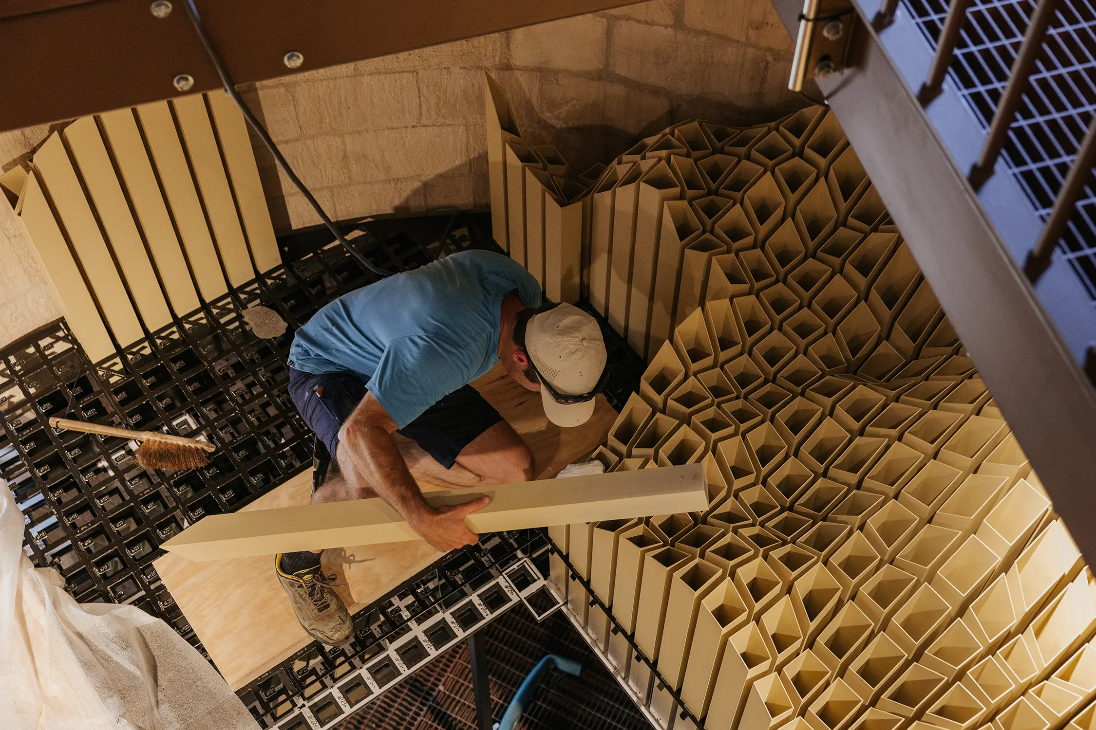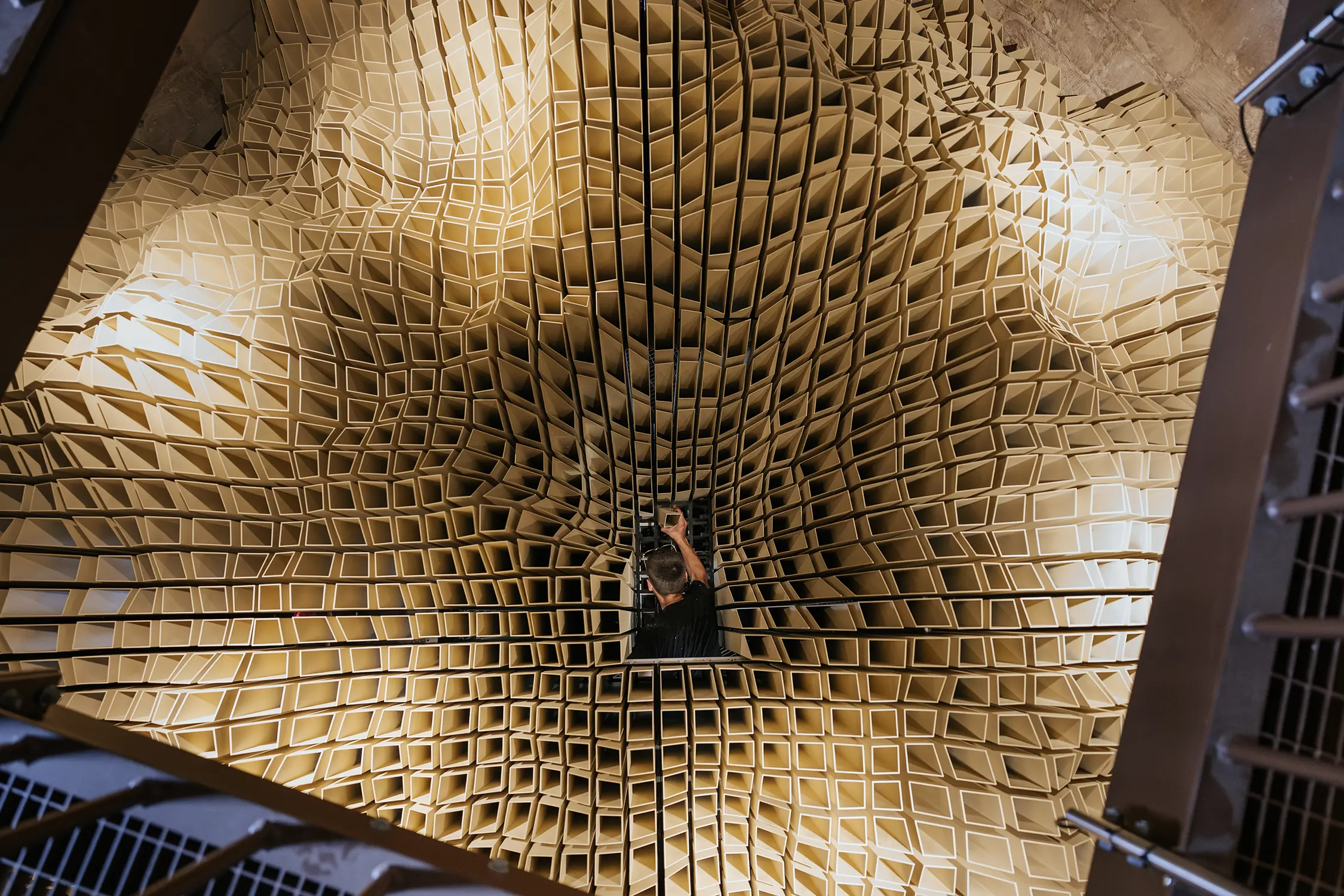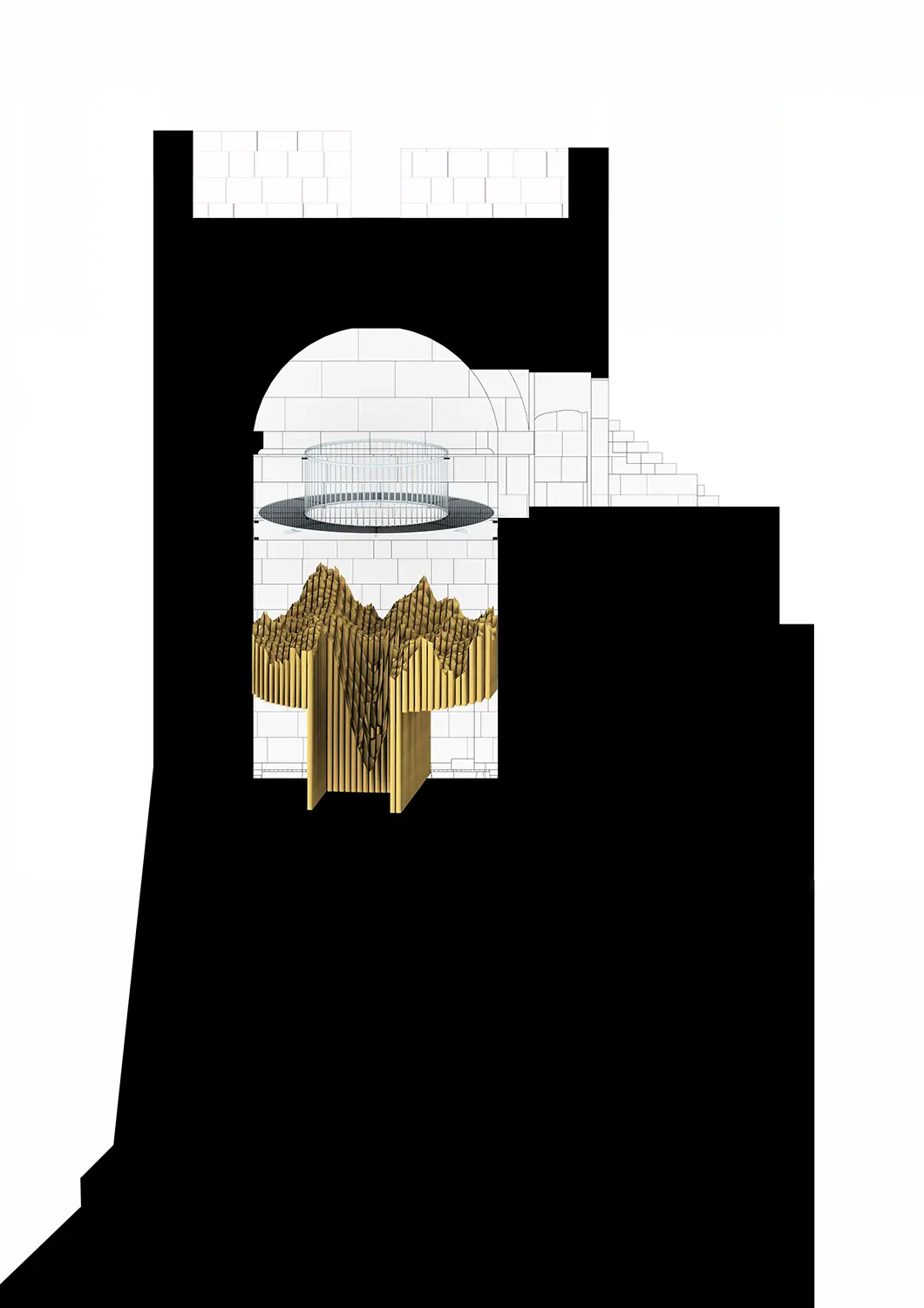 La Pierre et le Sablier, installation créée pour la Tour Puchot du Château de Caen, se compose de plusieurs étages à découvrir progressivement. Au sommet, des blocs métalliques s’empilent, en bas, une cavité semble se creuser au fur et à mesure de l’écoulement de la matière qui la compose. Une passerelle permet d’observer ce sablier géant. L’œuvre interroge notre rapport au temps, liant passé et présent, et à l’espace, la manière dont utilisons les ressources naturelles.