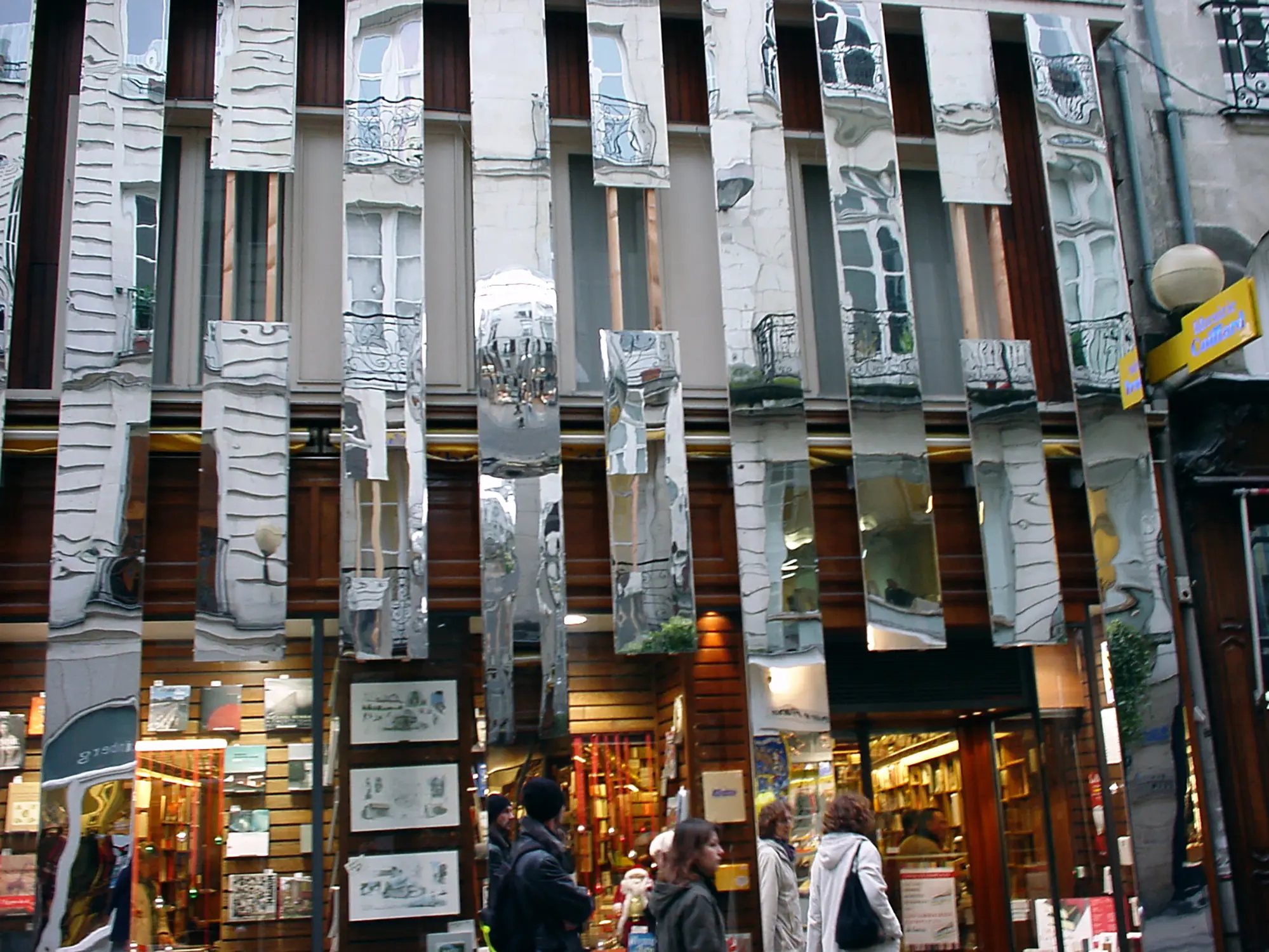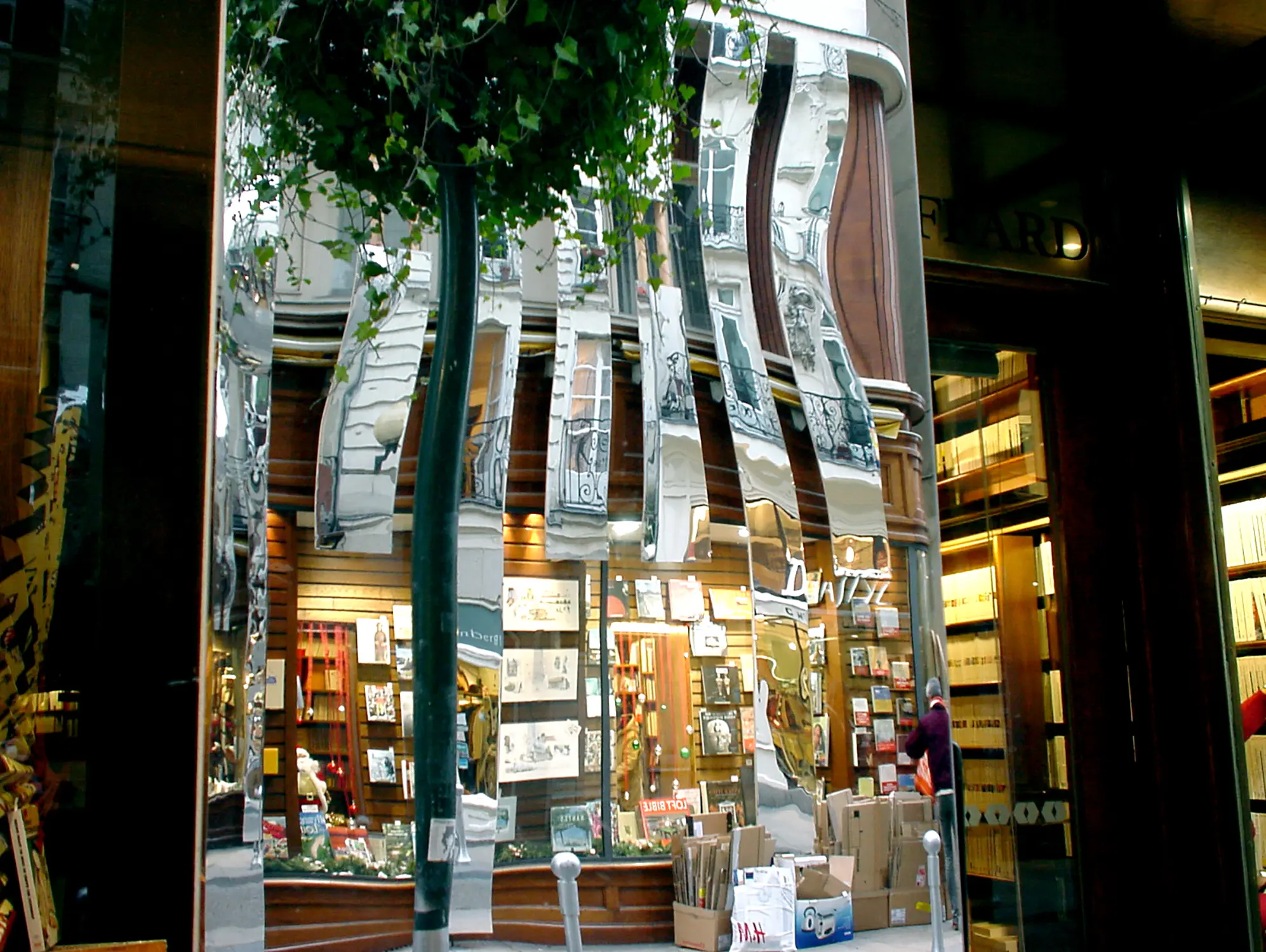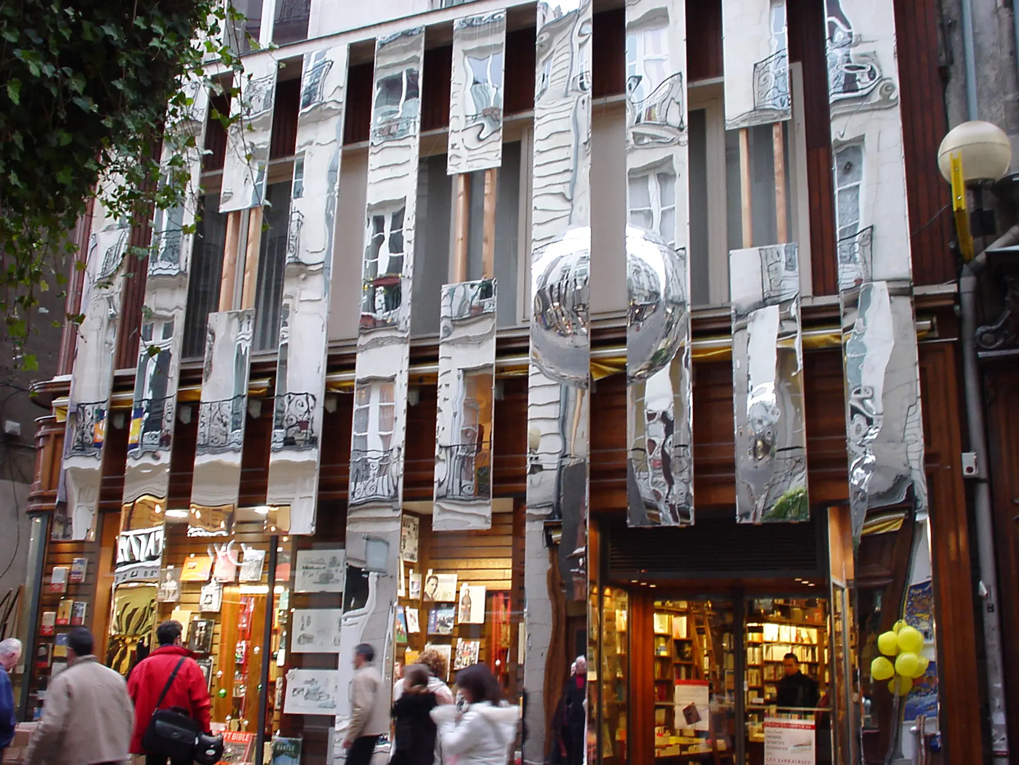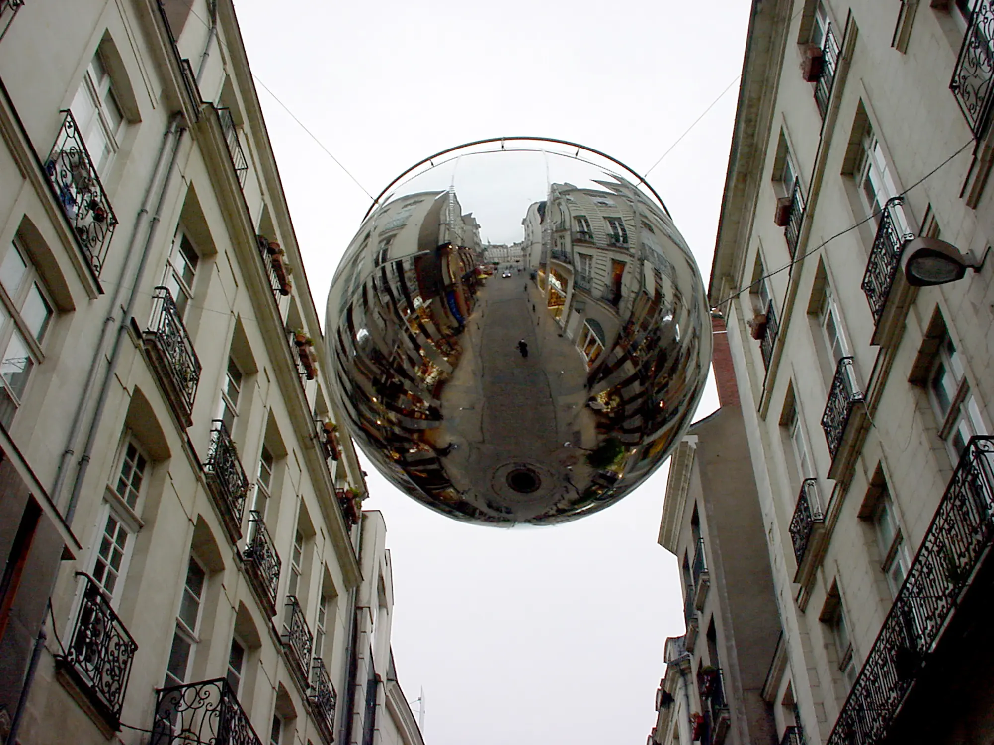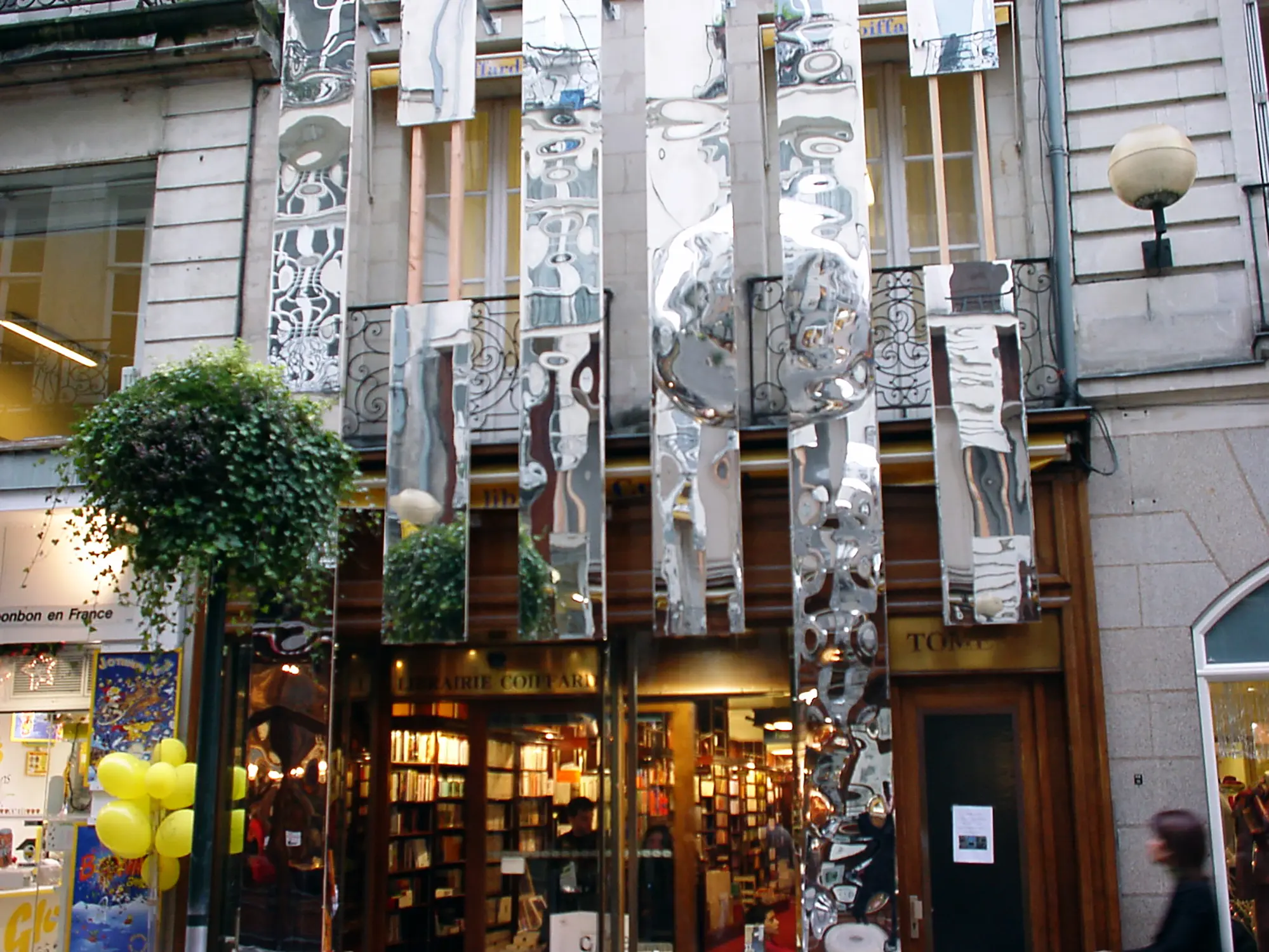 Des bandes de PMMA miroir habillent les deux boutiques en vis-à-vis de la librairie Coiffard. Une bulle gonflable de 2 m de diamètre surplombe la rue entre les deux façades. Un jeu subtil et déstabilisant de reflets produit un mimétisme et une mise en abîme de l’architecture du 18ème siècle de la rue de la Fosse.