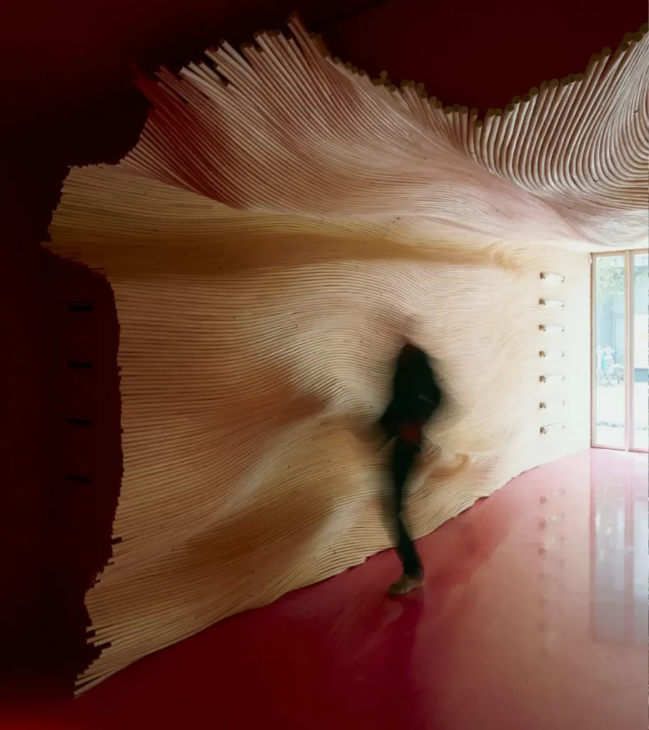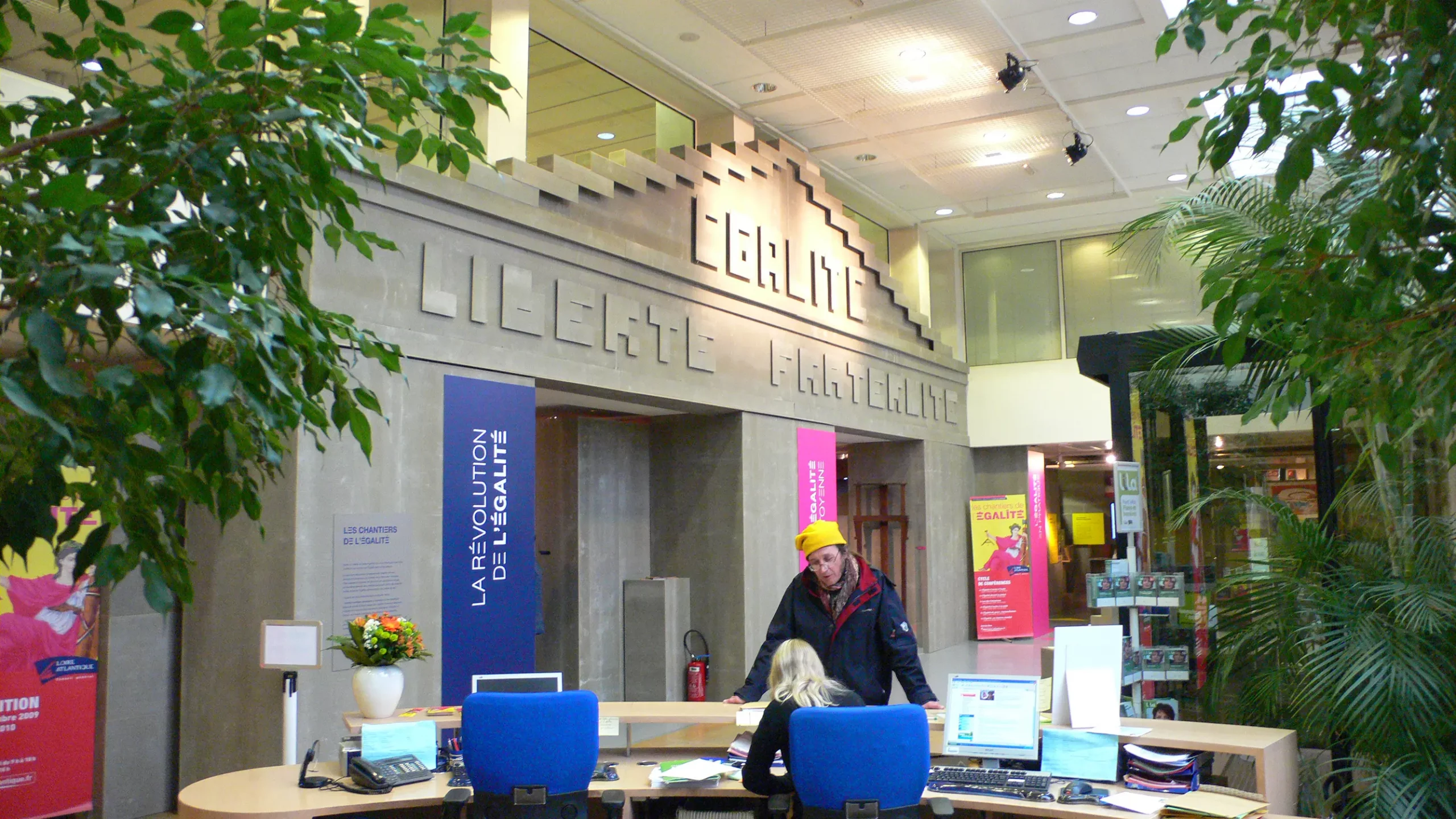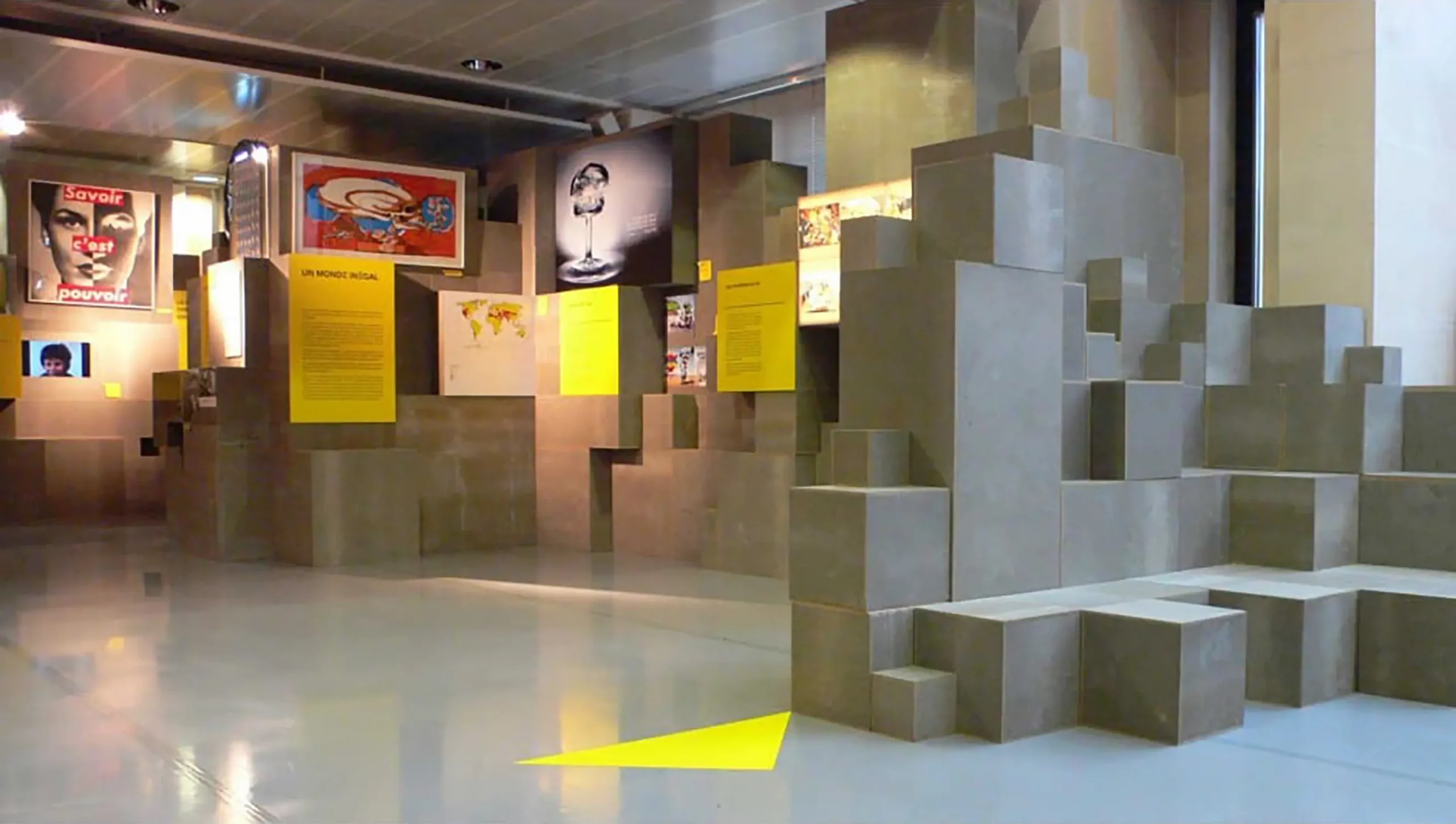 Une mono-matière (panneau de fibre ciment), une mono-couleur (gris) “voxélise” un espace mettant en exergue les inégalités induites par le principe même de l’idée citoyenne de l’égalité.