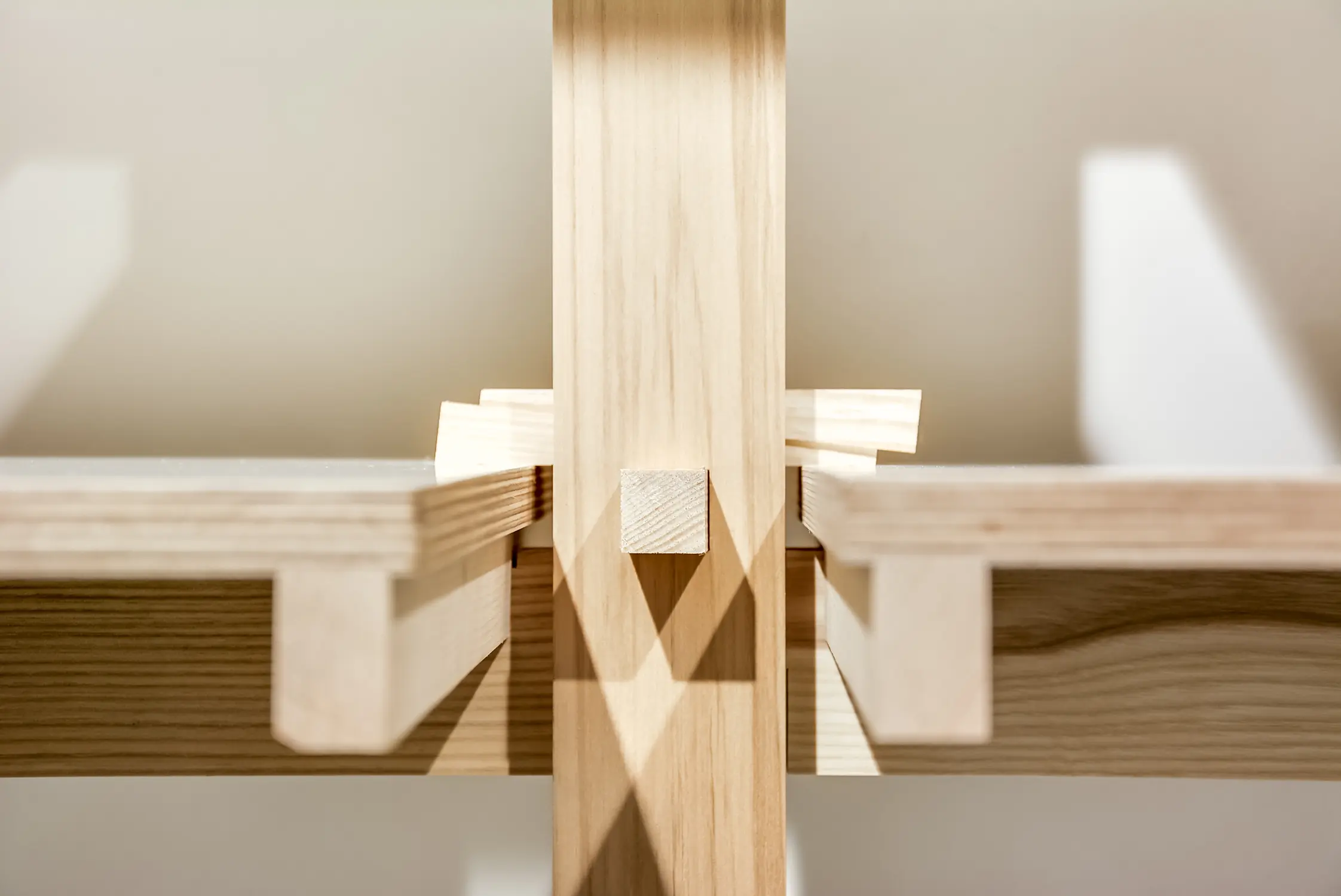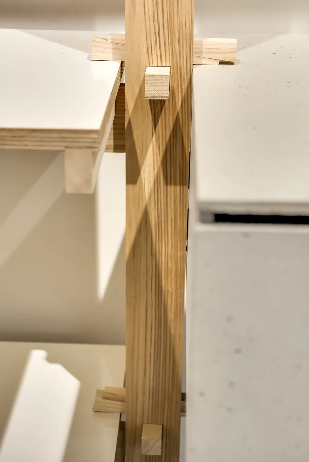 Ce système d’assemblages mécaniques, sans clou, ni vis, sortes de tenons et mortaises complexe, propose une relecture adaptée des montages de charpente traditionnelle japonaise. Il s’agit d’un système expérimental de clés en bois, mis au point spécifiquement avec l’entreprise Métalobil, qui vient successivement bloquer les pièces de bois à chaque hauteur des plateaux.