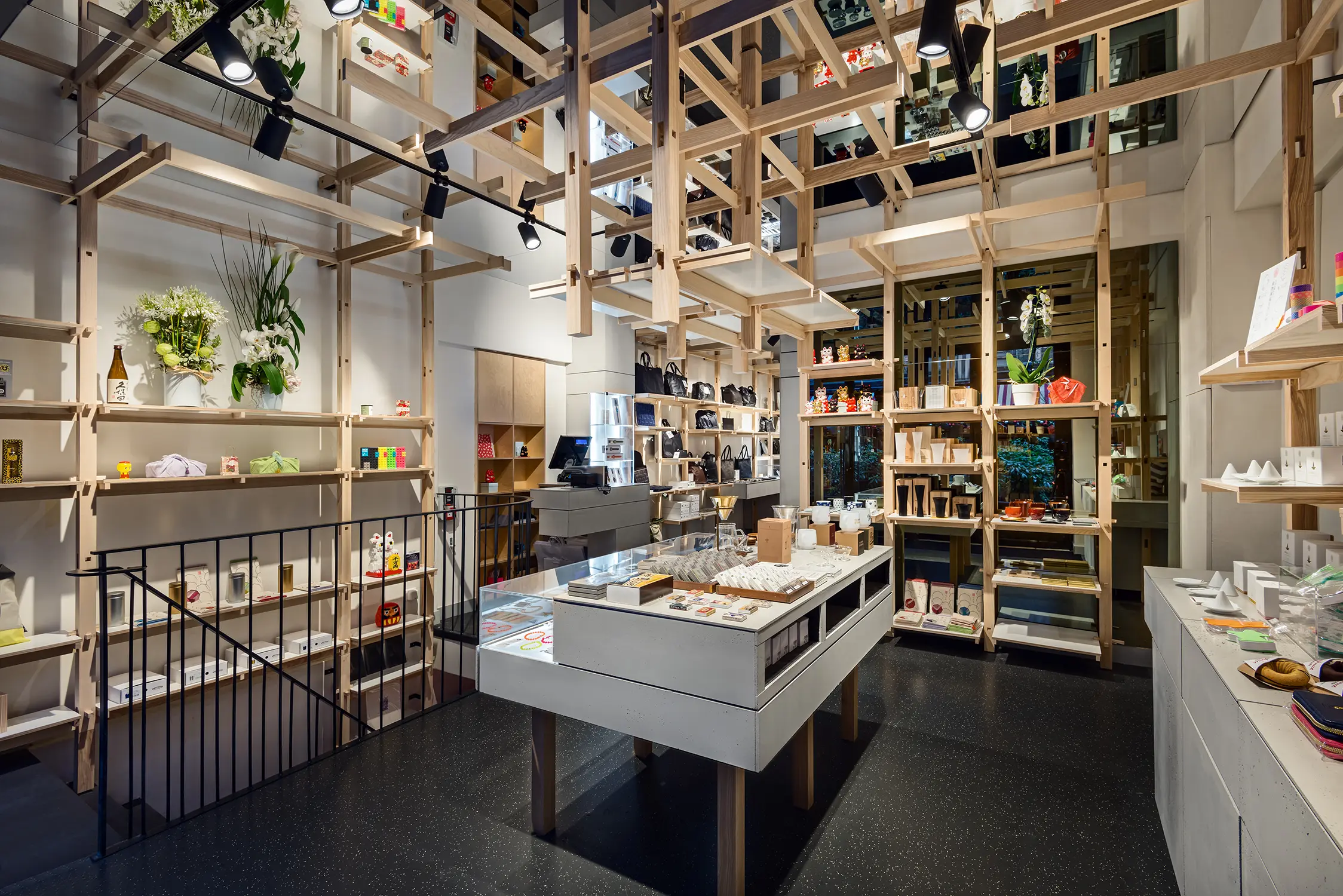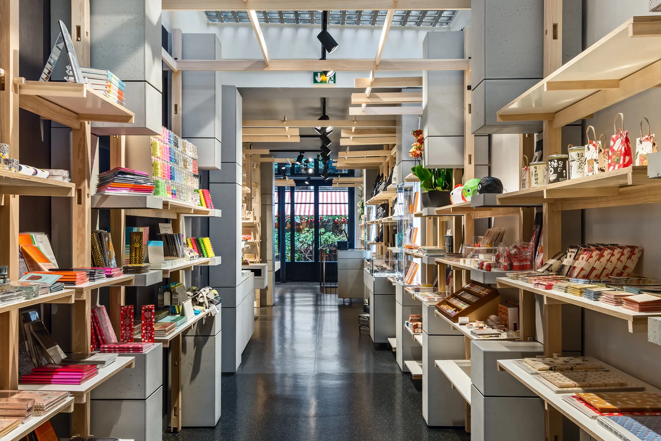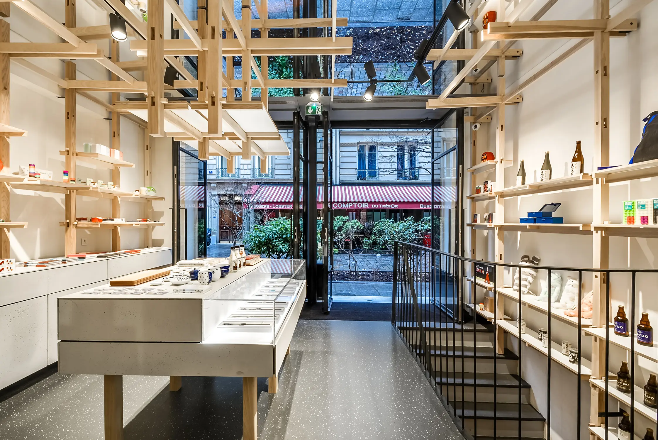 Déployée dans tout le volume de la boutique, une structure d’étagères conçue dans le bois clair du frêne-olivier se pose en contraste de la devanture sombre de la boutique. Installée le long des murs et jusqu’au plafond, la construction s’échafaude savamment selon un principe de ramifications dont le développement rhizomatique sous forme de grille géométrique est augmenté par un jeu de miroirs disposés au plafond.