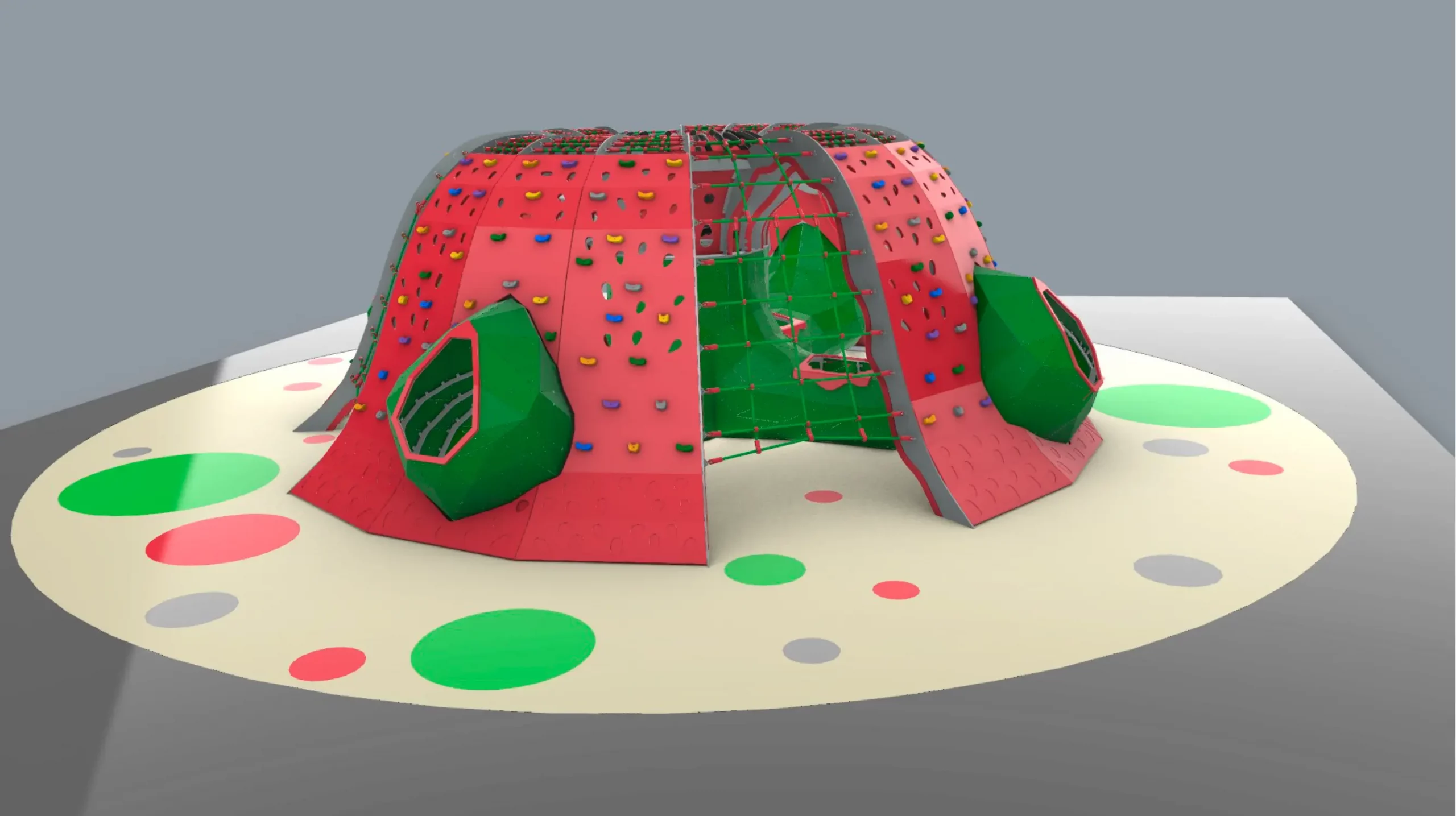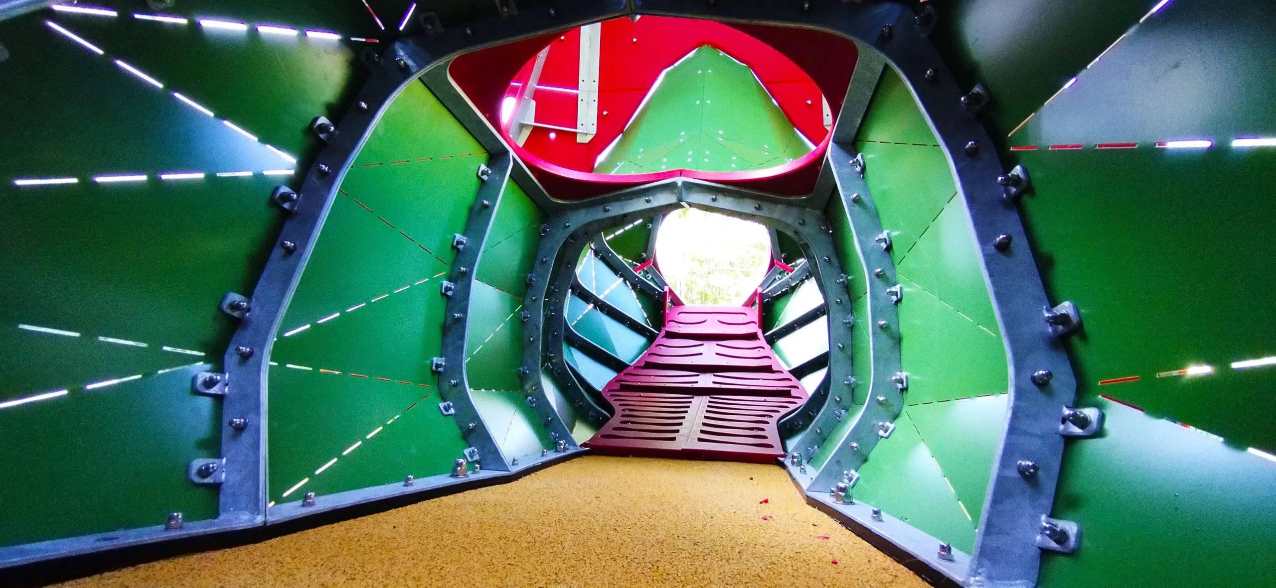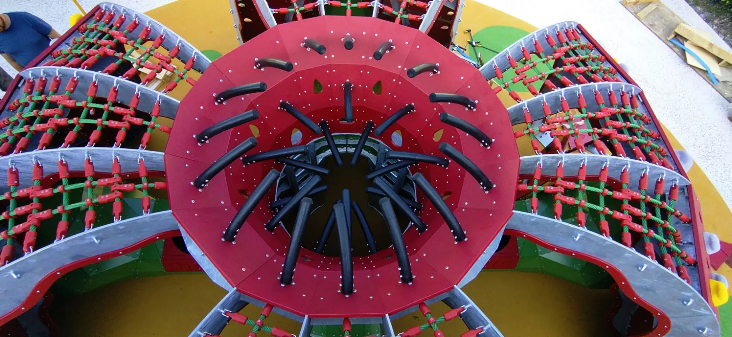 Les enfants pourront s’introduire par la bouche des Népenthes, et une fois dans leurs entrailles semées d’embuches, ils n’auront d’autres issues pour sortir que de gravir le centre de la fleur et de redescendre sur les grands pétales faits de filets et de panneaux composites. Les Népenthes, présentes des ouvertures vers l’extérieur du jeu par les quels les enfants s’introduiront pour converger vers le centre. A cet endroit précis, des cordes attendent les jeunes usagers pour les aider à grimper et à attraper les cils de caoutchouc afin de ressortir du coeur de la plante.