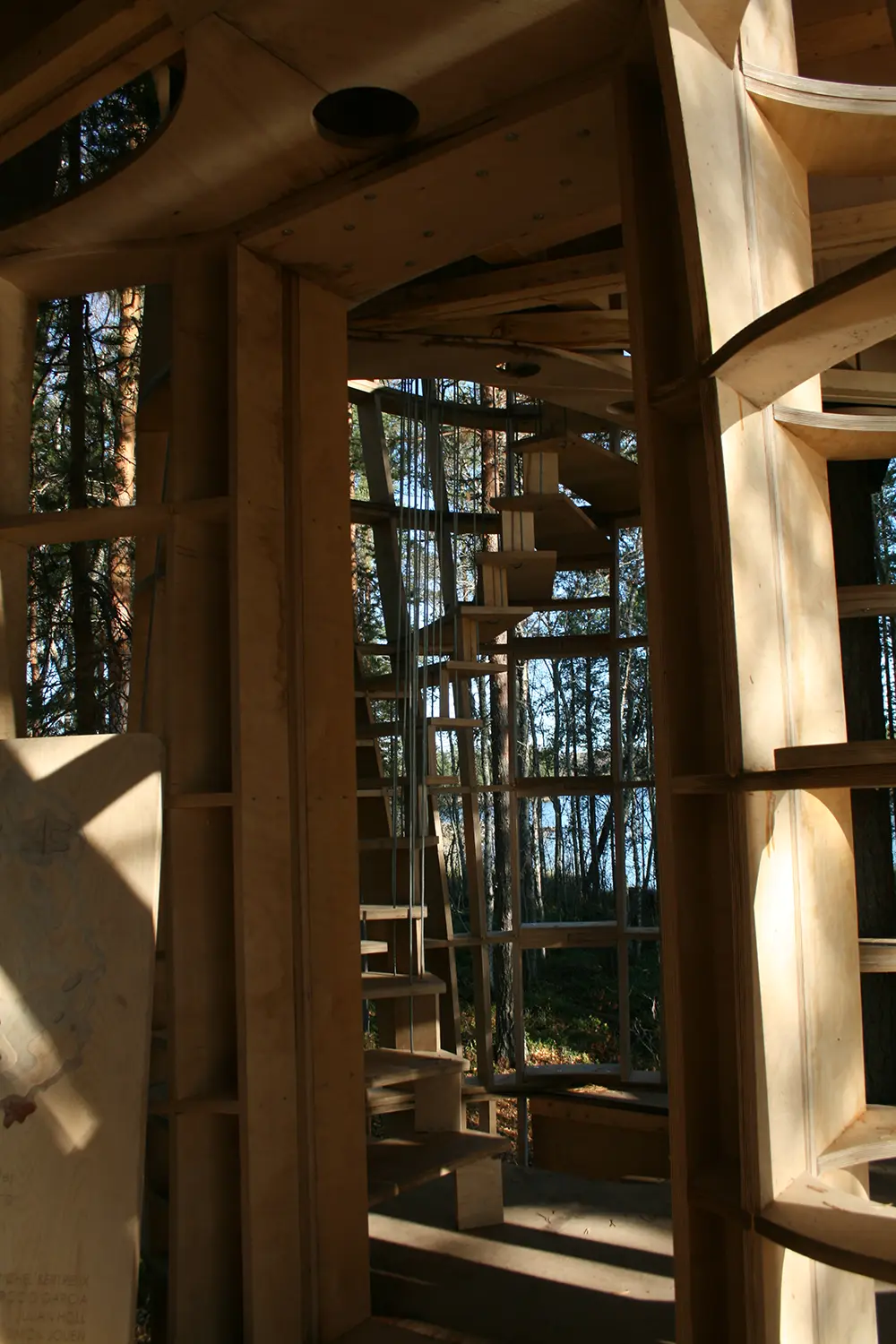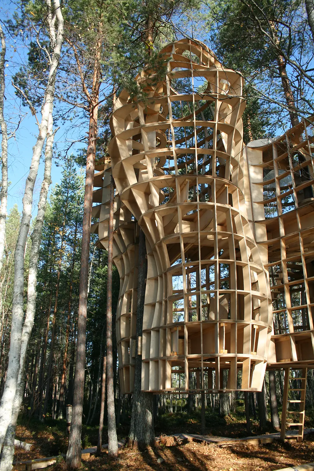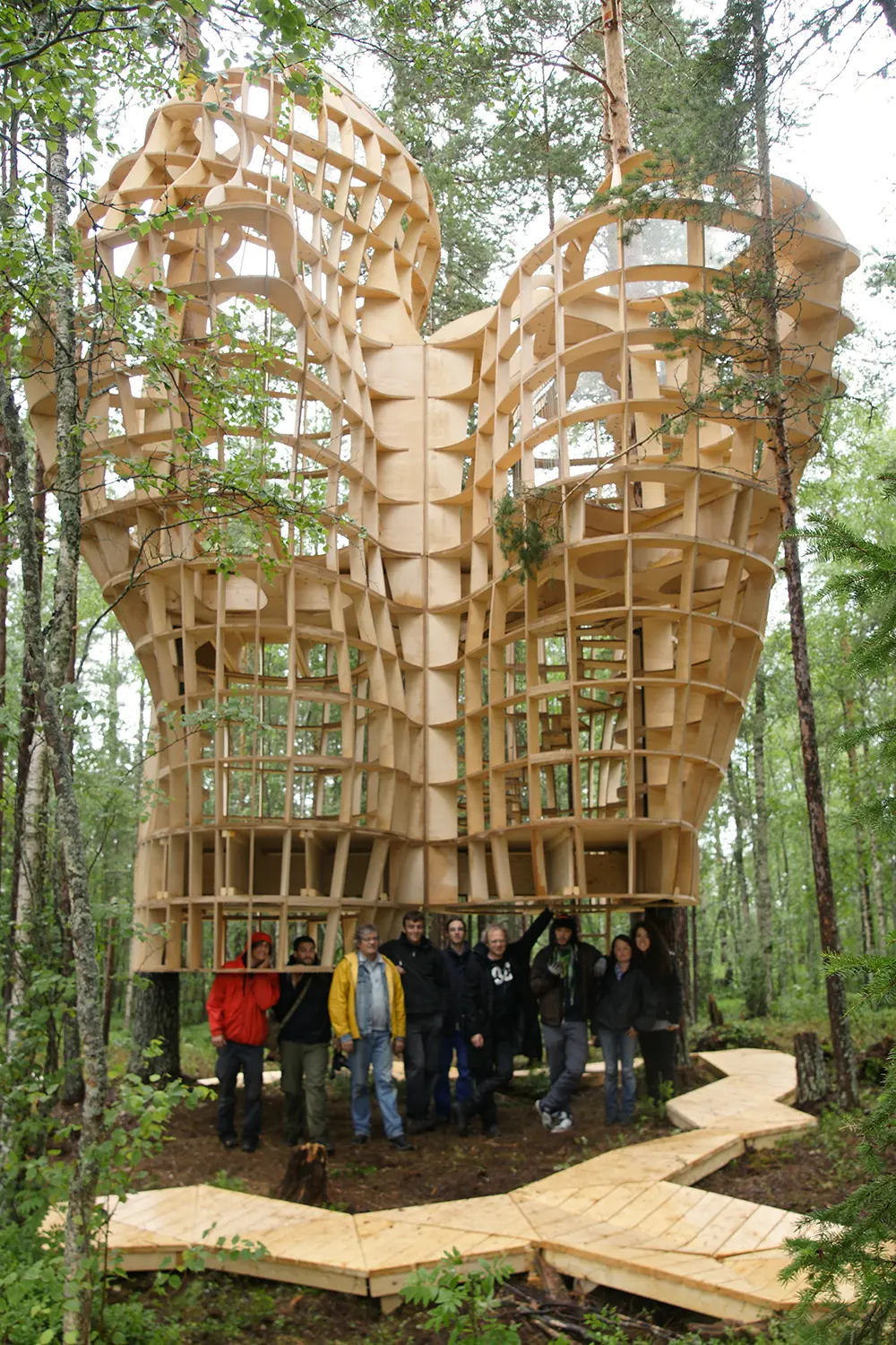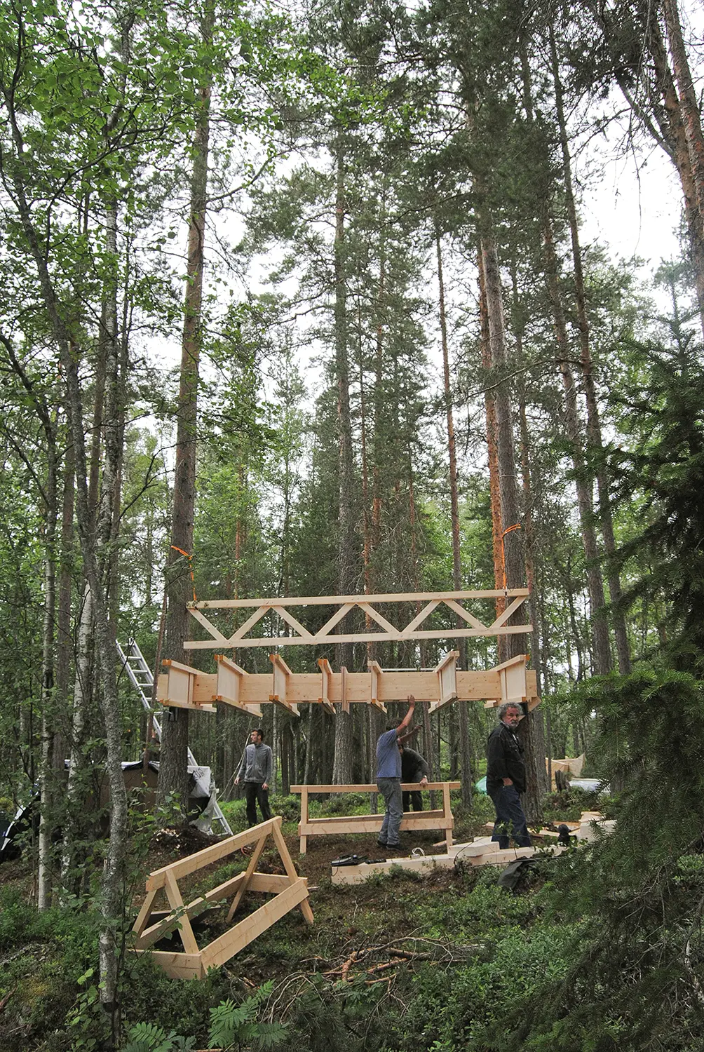 Utopie sauvage, prototype sculpture d’une cabane entre deux arbres, sur une île du lac du village d’Haverö aux confins de la Suède.