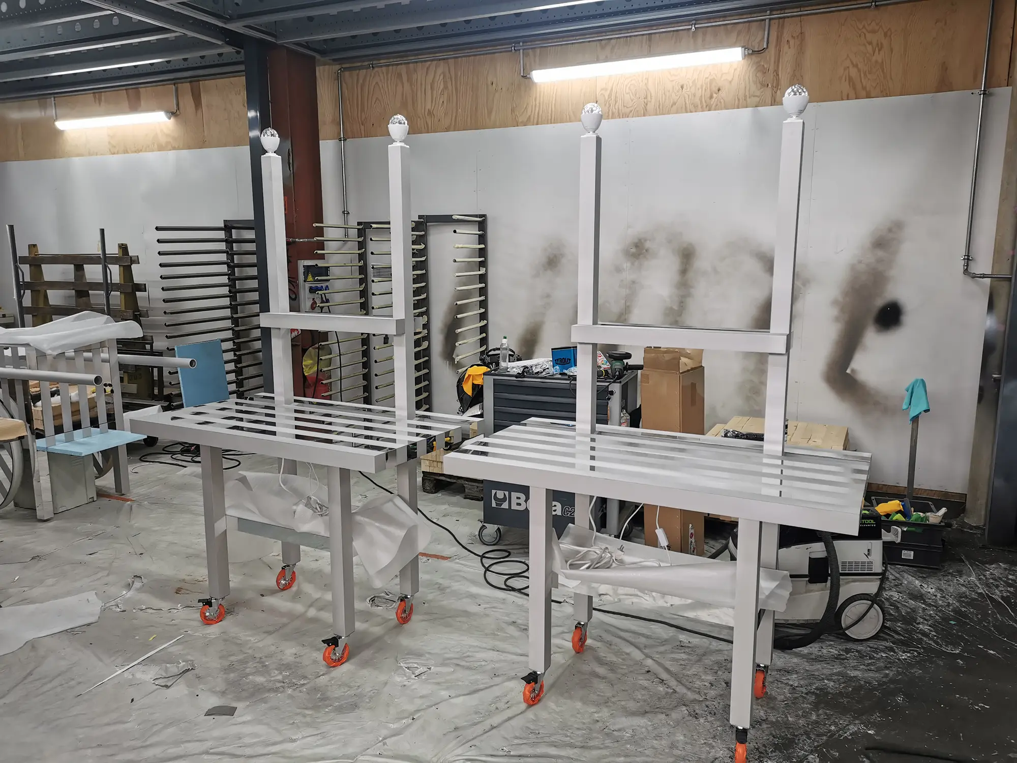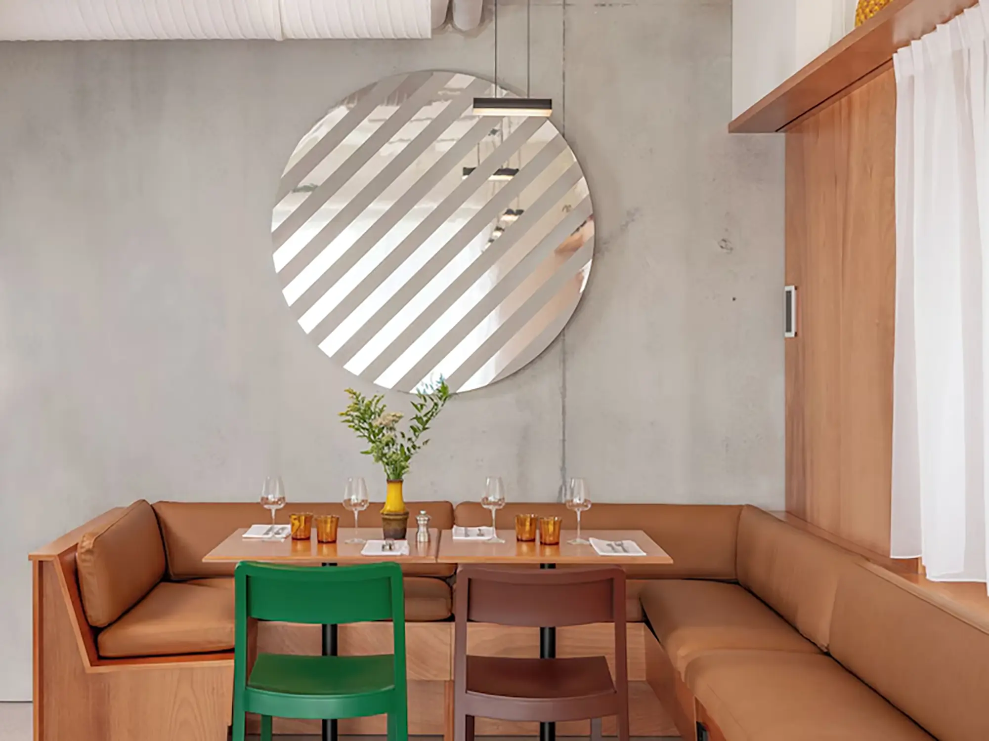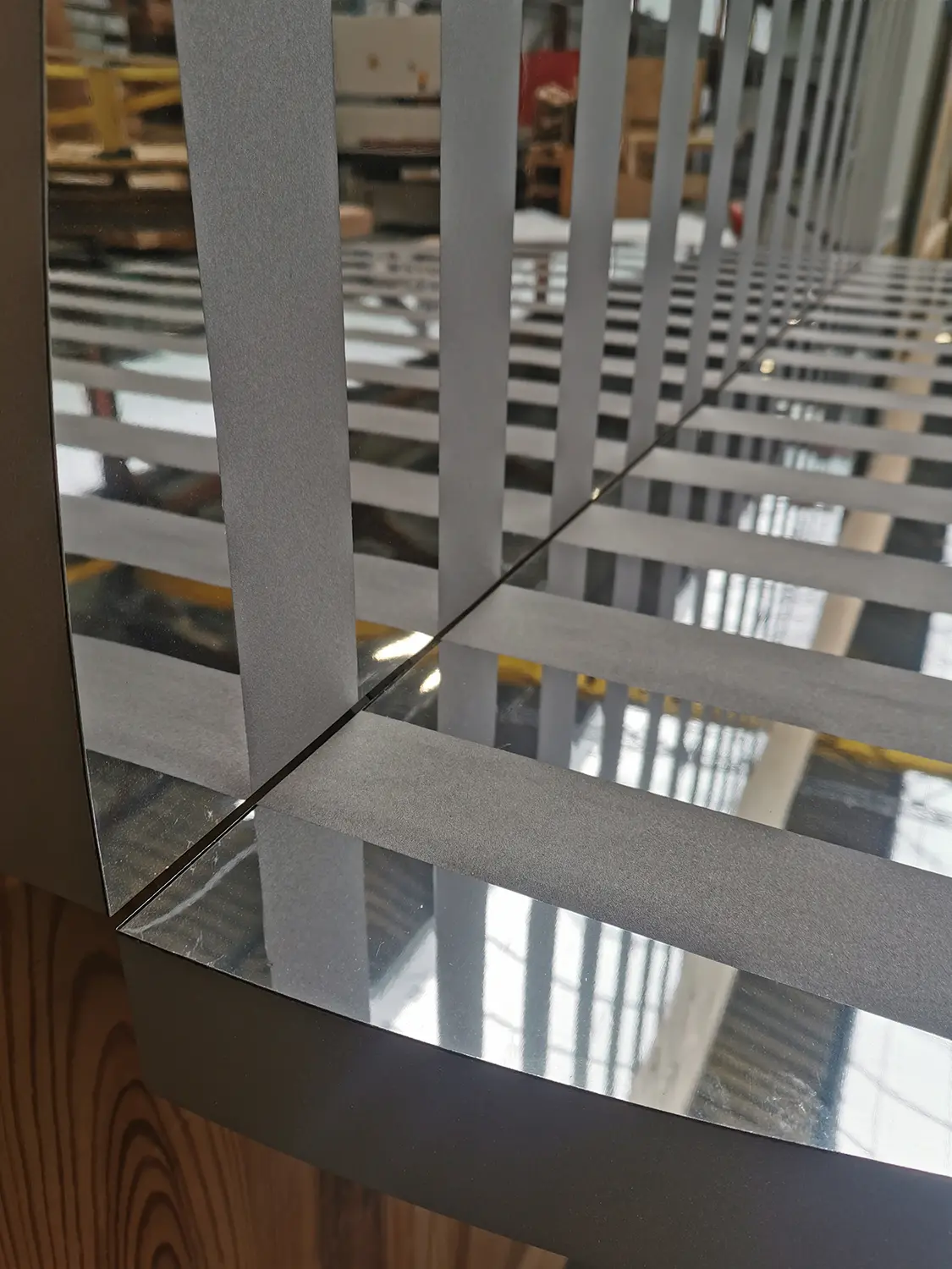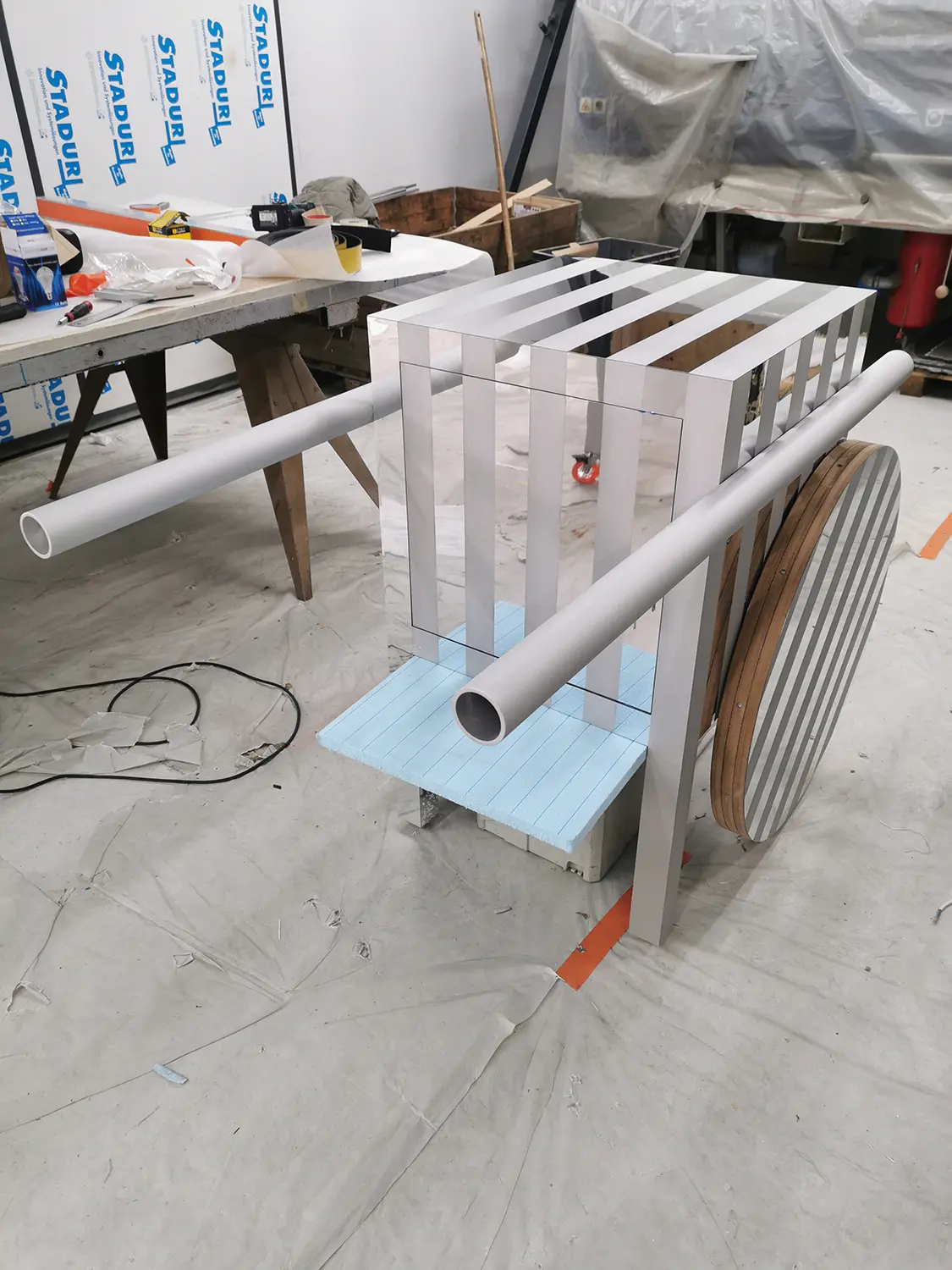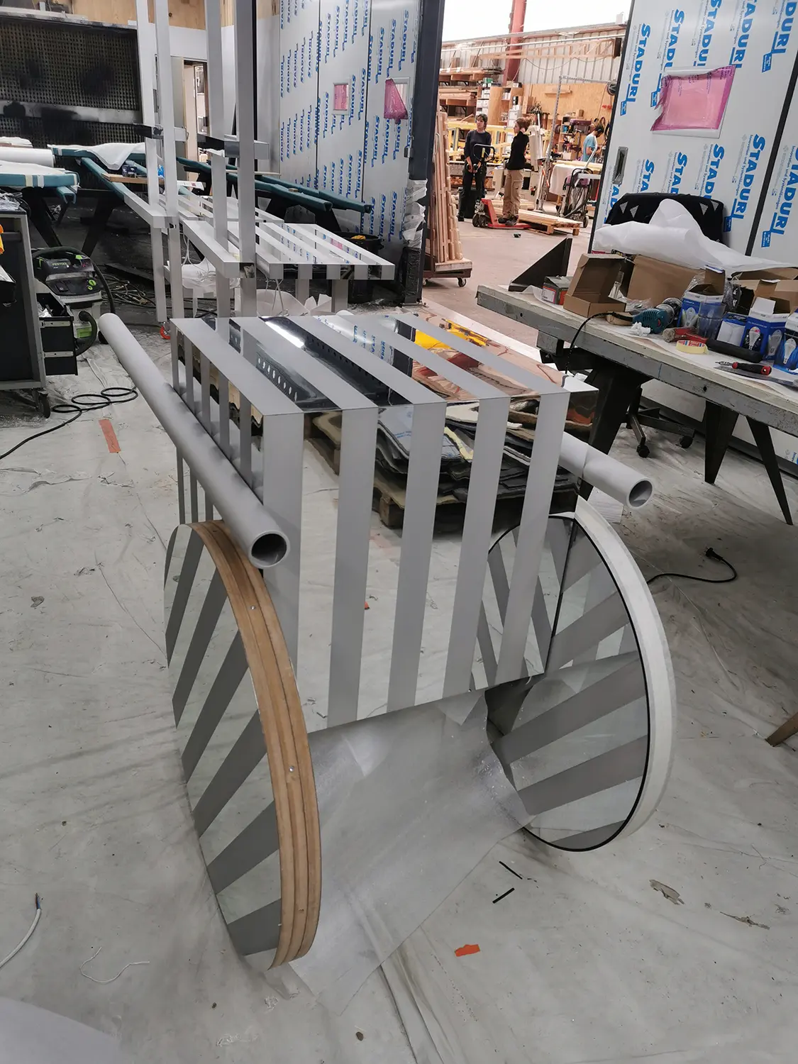 « Cette série d’objets – borne d’accueil, table console, meuble DJ, miroirs – doit être vue comme une contribution à l’ensemble des signes déjà existant définissant la culture balnéaire, cet espace de l’éphémère et de la spontanéité. OLONA se développe au point de rencontre entre le paysage naturel et l’échelle domestique, entre contexte local et touristique, entre habitat permanent et temporaire, culture et consommation, entre besoins réels et fantaisies saisonnières. OLONA puise son inspiration aussi bien dans les expériences collectives, des Vacances de Monsieur Hulot de Jacques Tati aux Design Balneare d’Ugo La Pietra, que dans celles plus intimes, de notre propre relation au bord de mer. L’ergonomie de ces objets, mobiles et modulables, s’inscrit dans une unité de mesure commune : la répétition de bandes fines, verticales, horizontales, parfois réfléchissantes, parfois brillantes, évoque les rayures en bichromie omniprésentes sur les plages, cabines, stores bannes, serviettes de bain, parasols (s’envolent sans prévenir). Les formes géométriques simples évoquent leur usage, suggère l’appropriation.  » J.B. Vétillard