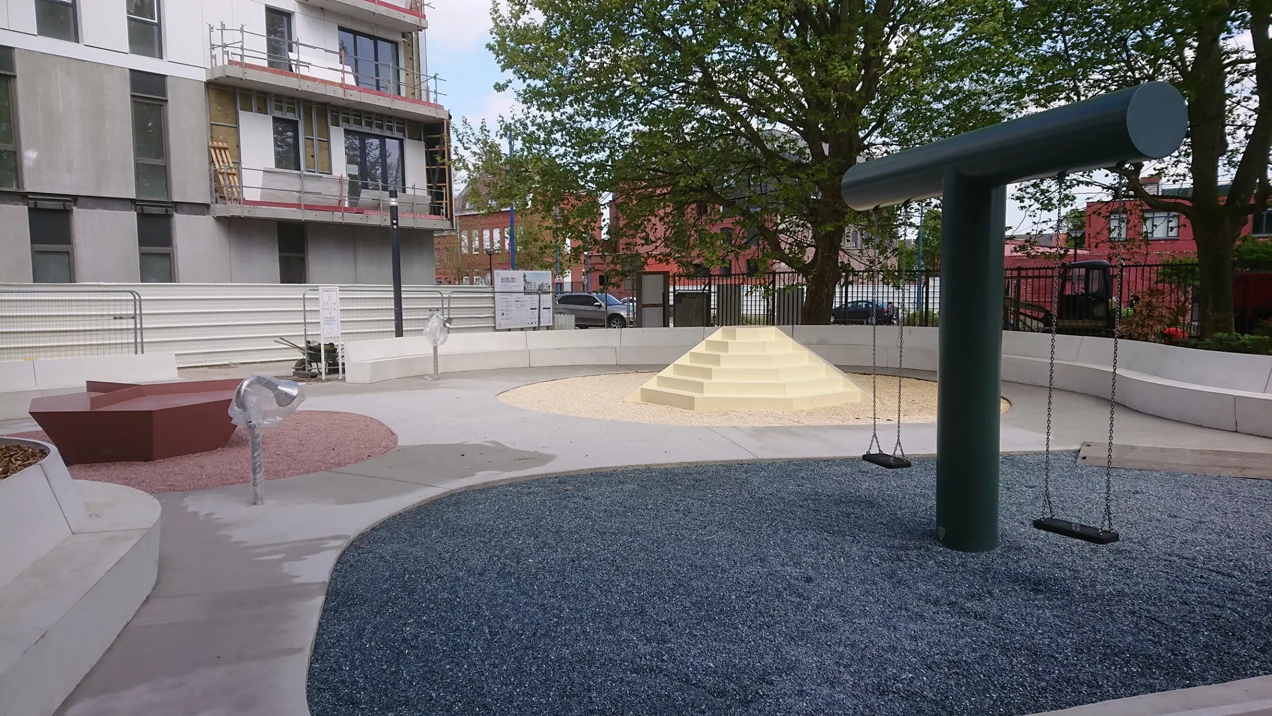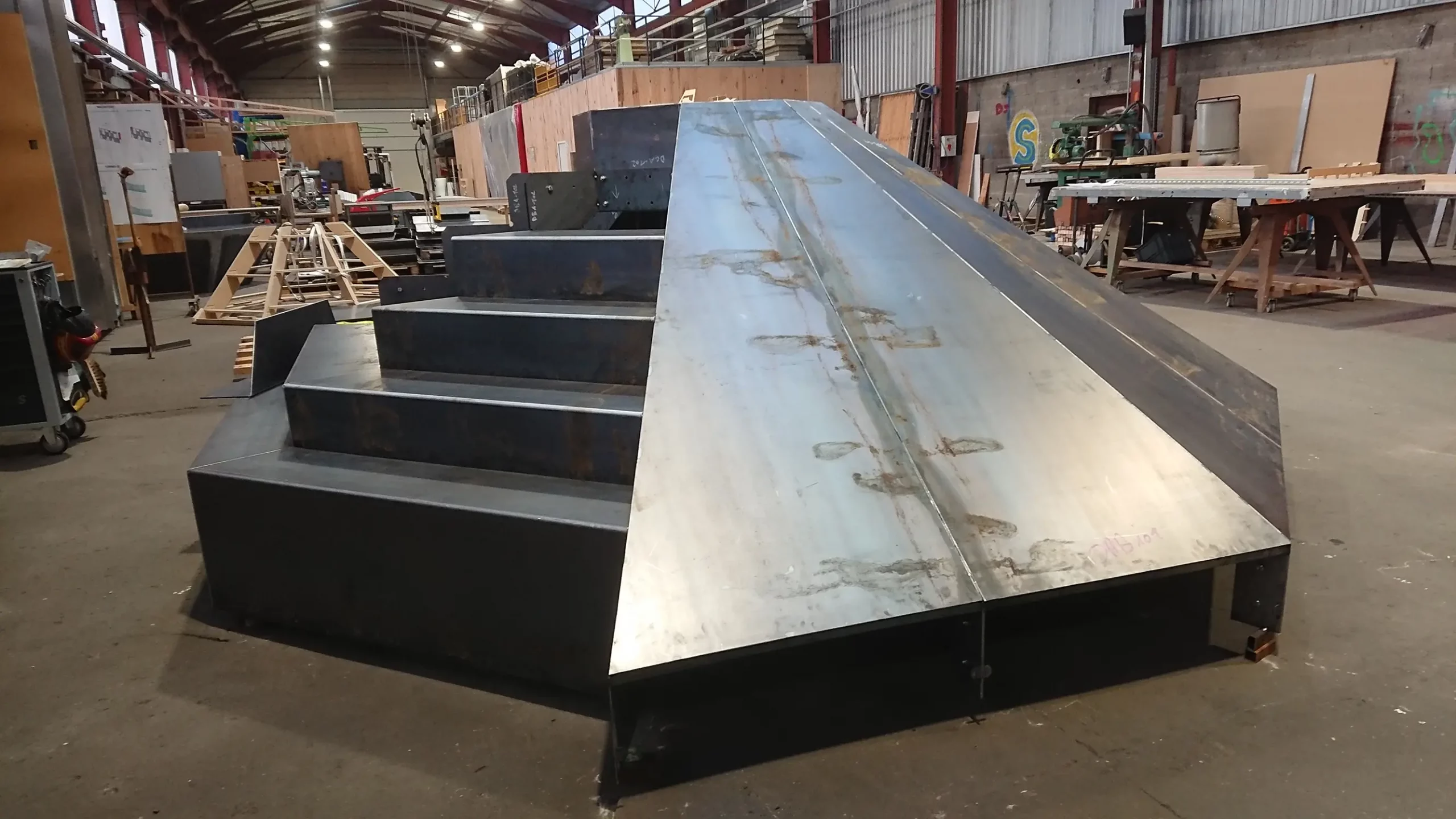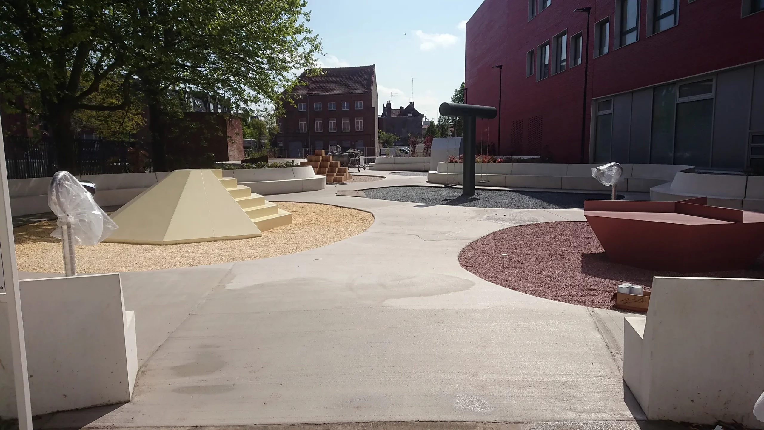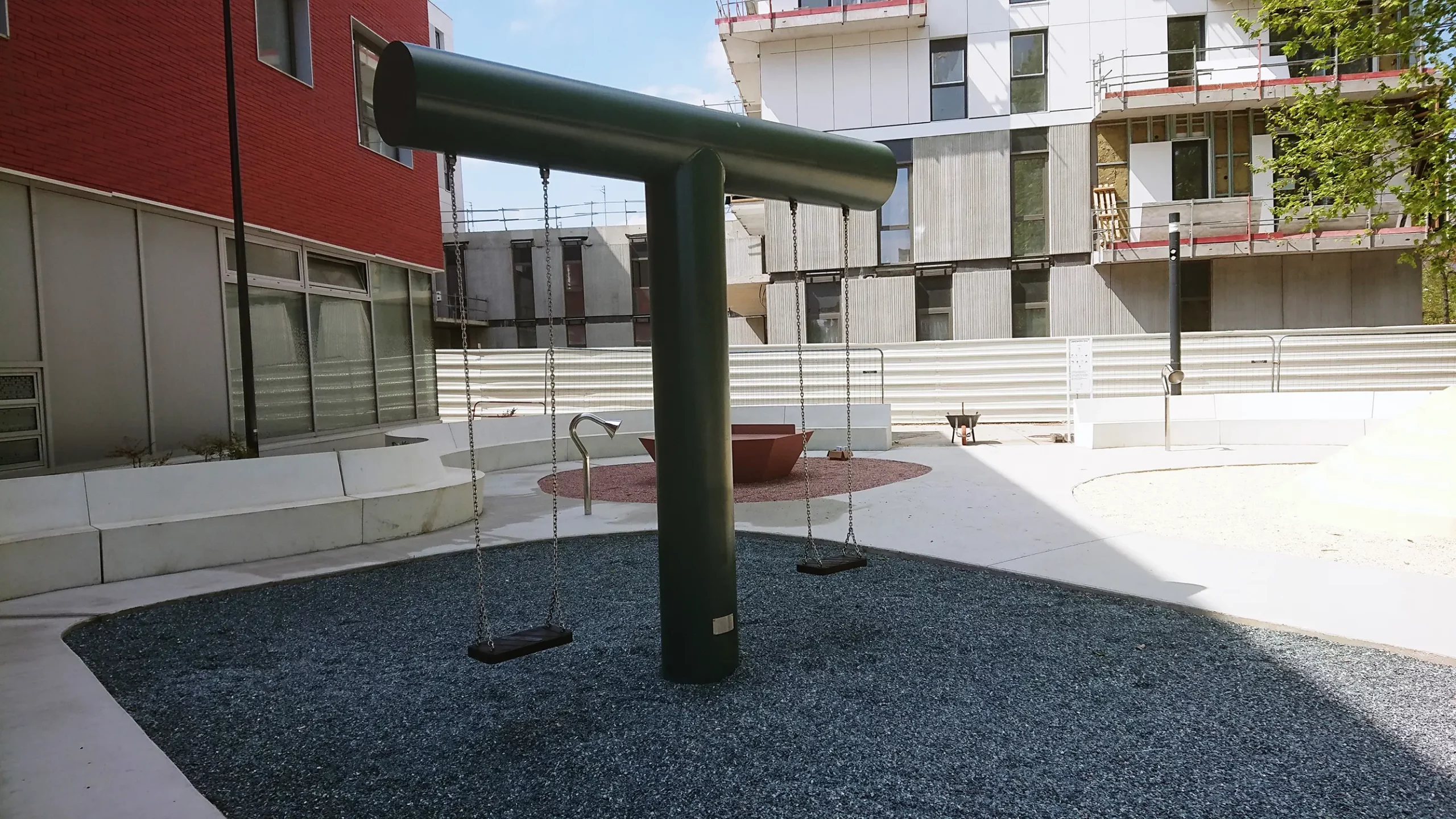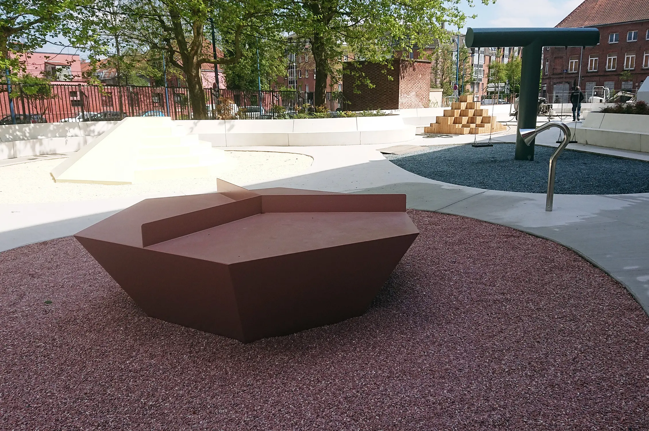 La table de “tri-pong”, la balançoire, la “pyramide glissière” et le “ringball” sont 4 micro-architectures monolithiques réalisées en acier, finition thermolaquée afin de respecter l’intention artistique d’obtenir des ouvrages monochromatiques et protéger les structures des intempéries.