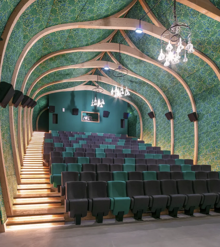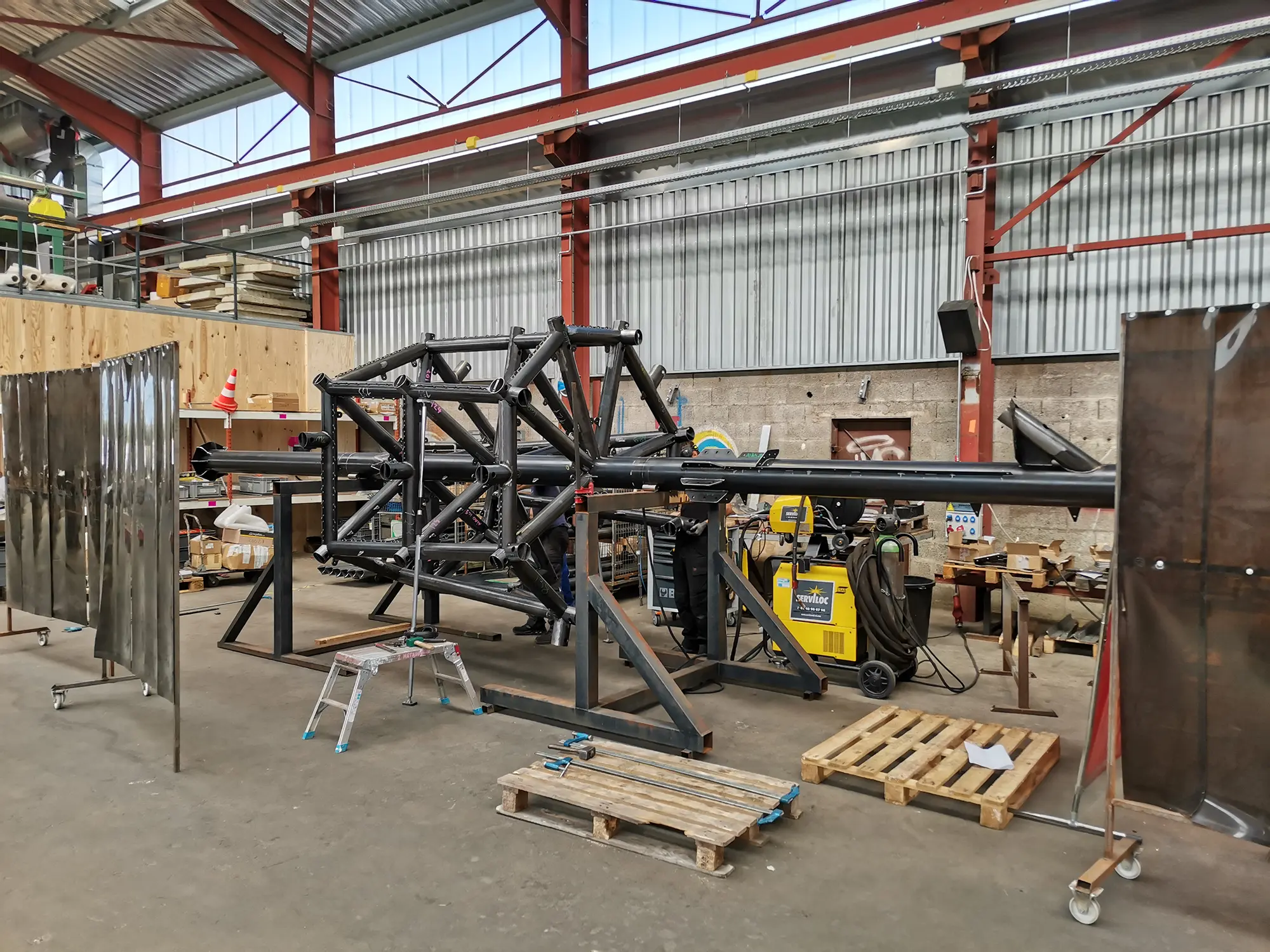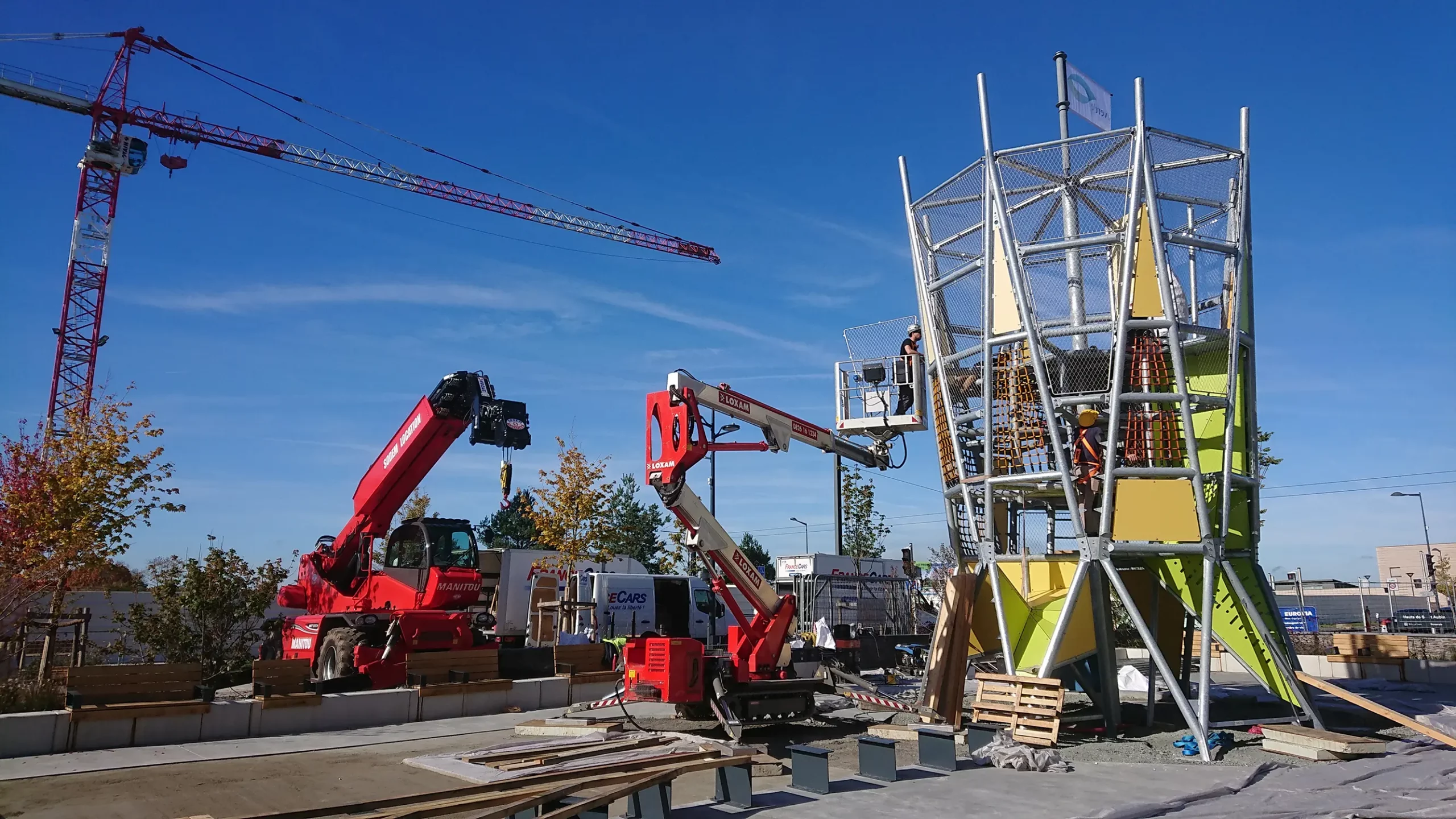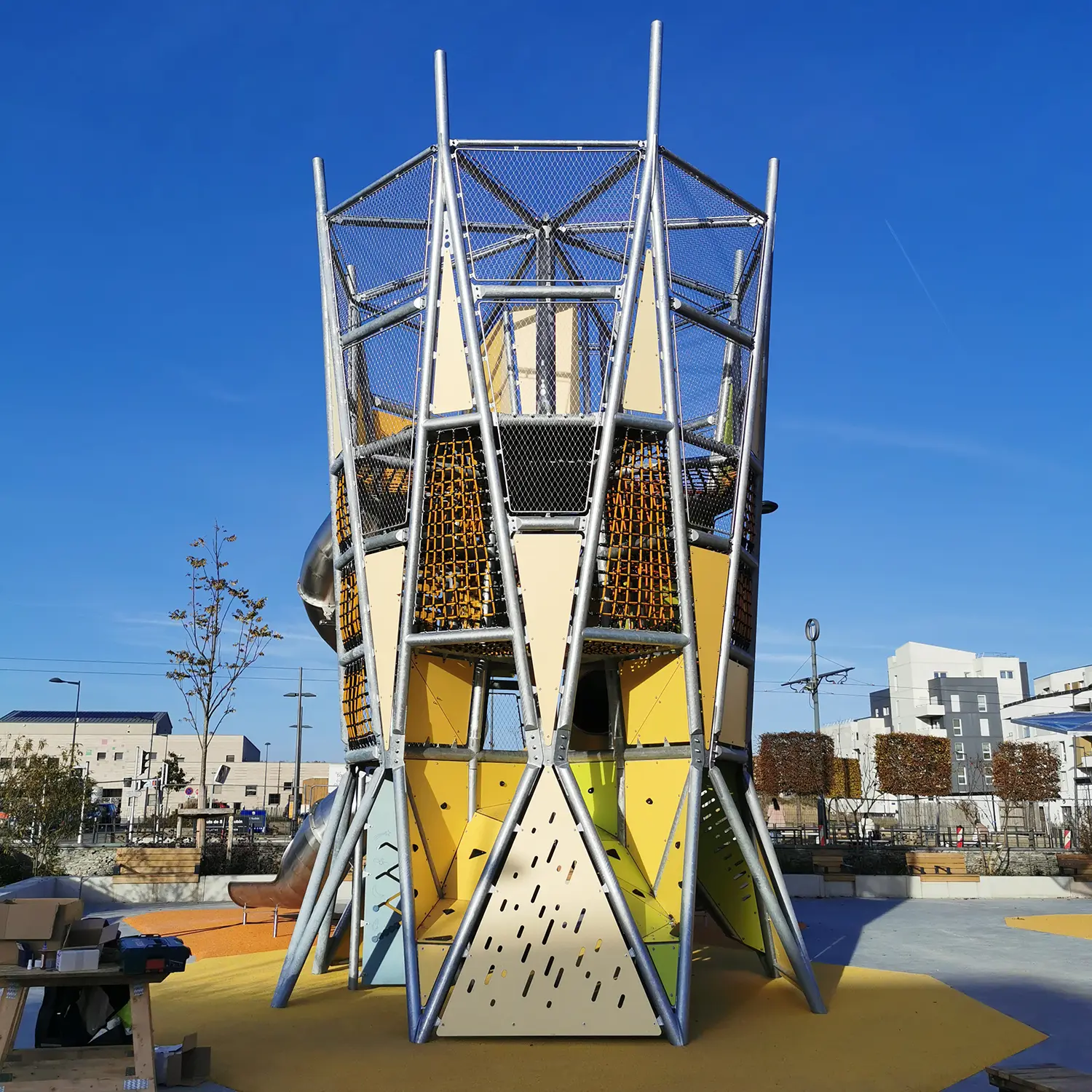 Structure de 8 mètres de haut et de 5 mètres de diamètre, en acier galvanisé, habillée de panneaux HPL, de mailles inox et de filets.