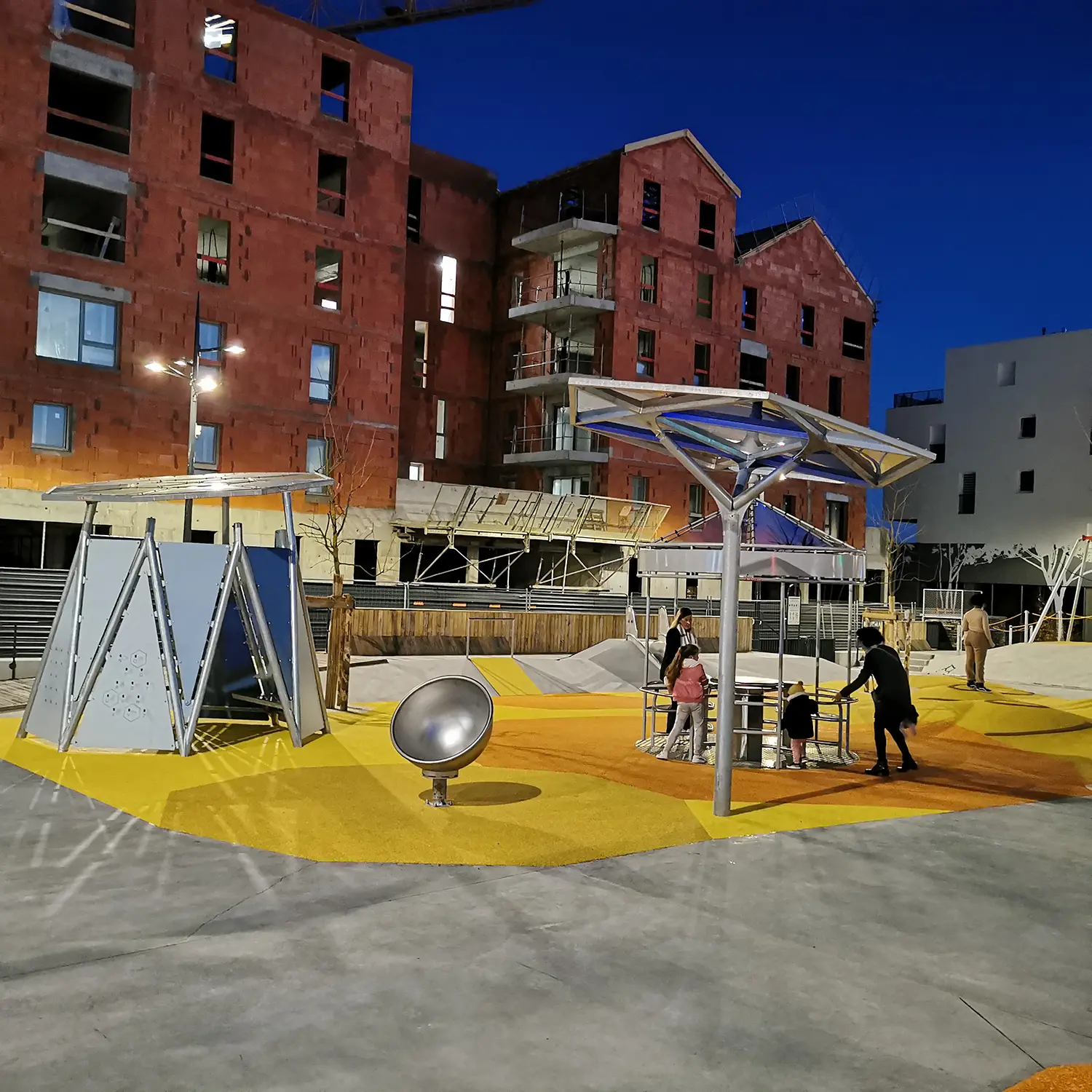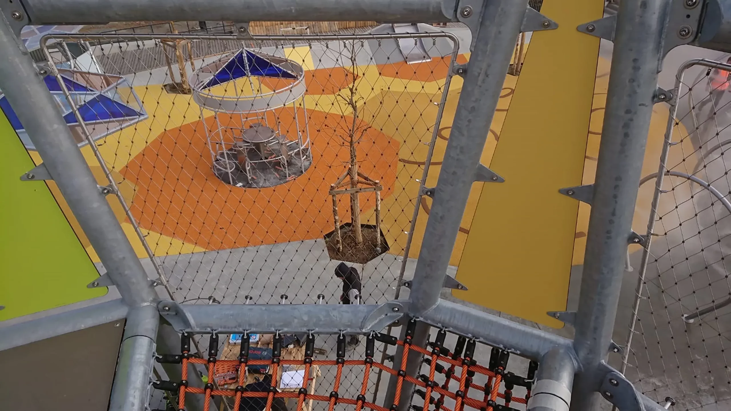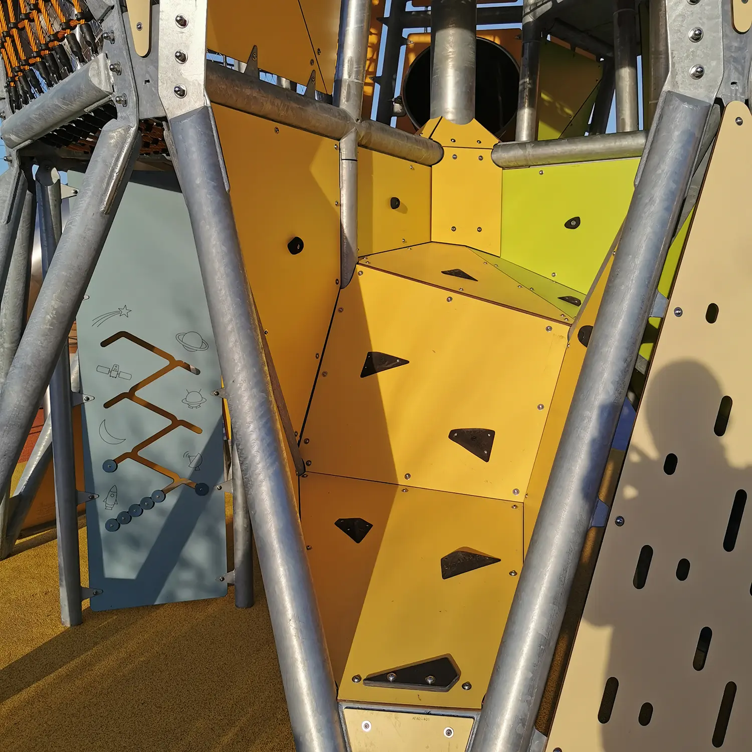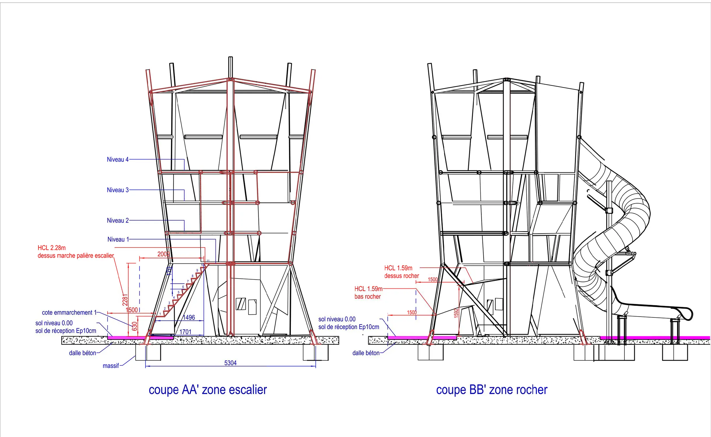 L’accès aux différents niveaux se fait par des échelles, murs d’escalades et également des filets. Le jeu se termine par 2 glissières inox : pour les plus petits, du premier niveau à 2,5m de hauteur, pour les plus grands, du dernier niveau à 6,5m de hauteur.